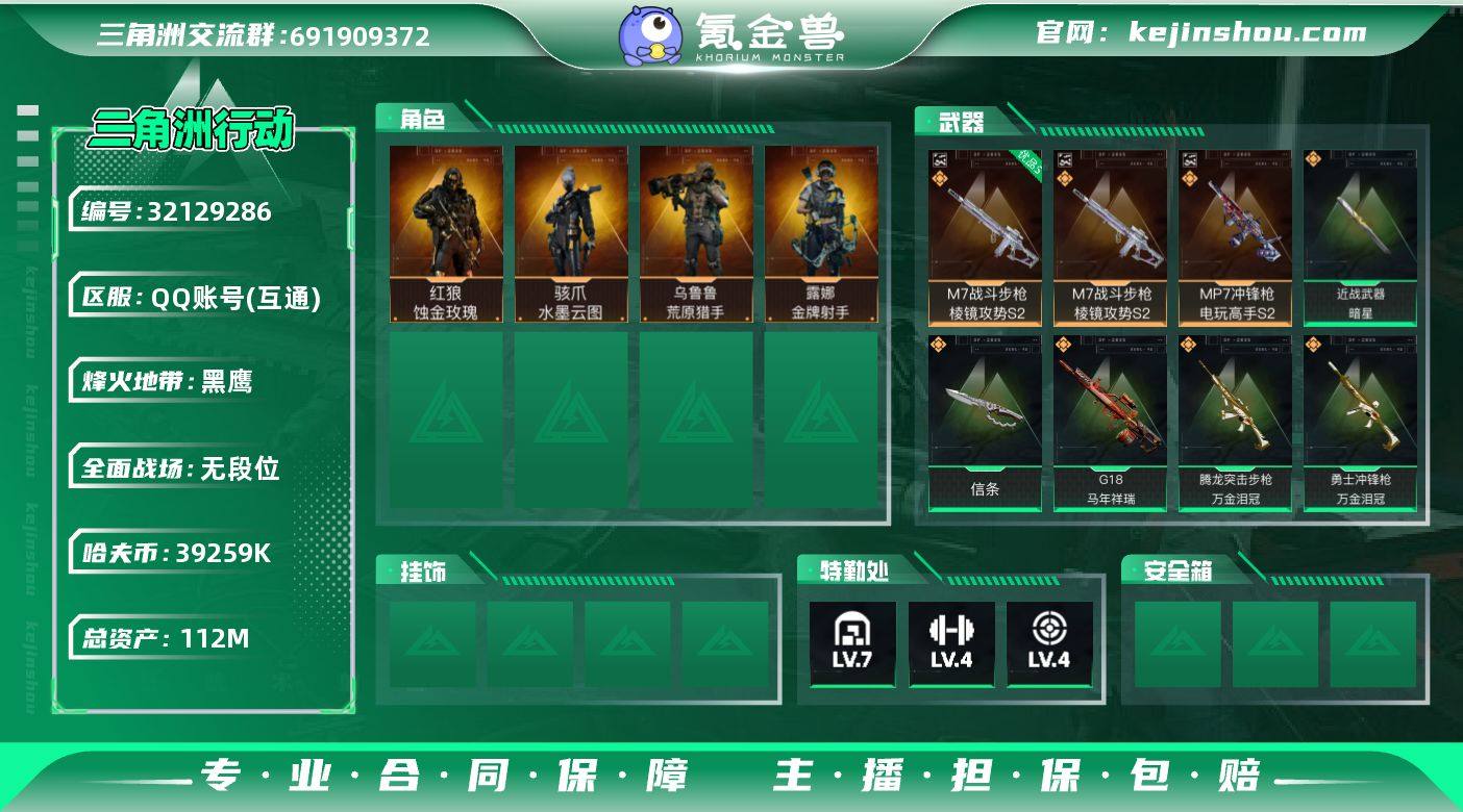 【sjz4665】112m总资产-39259k哈伏币-60烽火等级-黑鹰-4战场等级-无军衔 【干员外观】:红狼-蚀金玫瑰,骇爪-水墨云图,露娜-金牌射手,乌鲁鲁-荒原猎手 【近战皮肤】:近战-暗星,近战-信条,近战-黑鹰 【典藏外观】:M7战斗步枪-棱镜攻势S2,MP7冲锋枪-电玩高手S2 【典藏外观成色】:M7战斗步枪-棱镜攻势S2(优品S),MP7冲锋枪-电玩高手S2(优品S) 【传说外观】:M4A1突击步枪-蚀金玫瑰,SG552突击步枪-运动员,SCAR-H战斗步枪-水墨云图,SCAR-H战斗步枪-荼蘼,PTR-32突击步枪-赏金猎人,腾龙突击步枪-万金泪冠,MK47突击步枪-暗星,P90冲锋枪-信条,SMG-45冲锋枪-趣味文化,SR-3M紧凑突击步枪-暗星,SR-3M紧凑突击步枪-荼蘼,勇士冲锋枪-万金泪冠,MP7冲锋枪-趣味文化,725双管霰弹枪-赏金猎人,PKM通用机枪-荼蘼,M14射手步枪-蛮荒,M14射手步枪-缄花,SKS射手步枪-骑士,SR-25射手步枪-信条,VSS射手步枪-趣味文化,AWM狙击步枪-万金泪冠,.357左轮-赏金猎人,G18-马年祥瑞 【史诗外观】:K416突击步枪-冬日风情,K416突击步枪-腊梅,K416突击步枪-阿萨拉特攻,M7战斗步枪-百步穿杨,G3战斗步枪-流沙送葬,G3战斗步枪-哈夫克警备,AS Val突击步枪-百步穿杨,K437突击步枪-丛影谍踪,MP5冲锋枪-深海恐惧,MP5冲锋枪-竞技风,Vector冲锋枪-百步穿杨,SMG-45冲锋枪-阿萨拉特攻,SR-3M紧凑突击步枪-开工大吉,勇士冲锋枪-丛影谍踪,MP7冲锋枪-六套之力,S12K霰弹枪-曙光,M249轻机枪-丛影谍踪,M250通用机枪-囚徒,QJB201轻机枪-炽焰,VSS射手步枪-丛影谍踪,M14射手步枪-工业狂潮,M700狙击步枪-百步穿杨,M700狙击步枪-哈夫克警备,AWM狙击步枪-流沙送葬 【稀有外观】:M4A1突击步枪-银灰金属,M700狙击步枪-旧梦,SG552突击步枪-巨兽,K437突击步枪-巨兽,AUG突击步枪-千里骏骨,M4A1突击步枪-繁盛,AKM突击步枪...