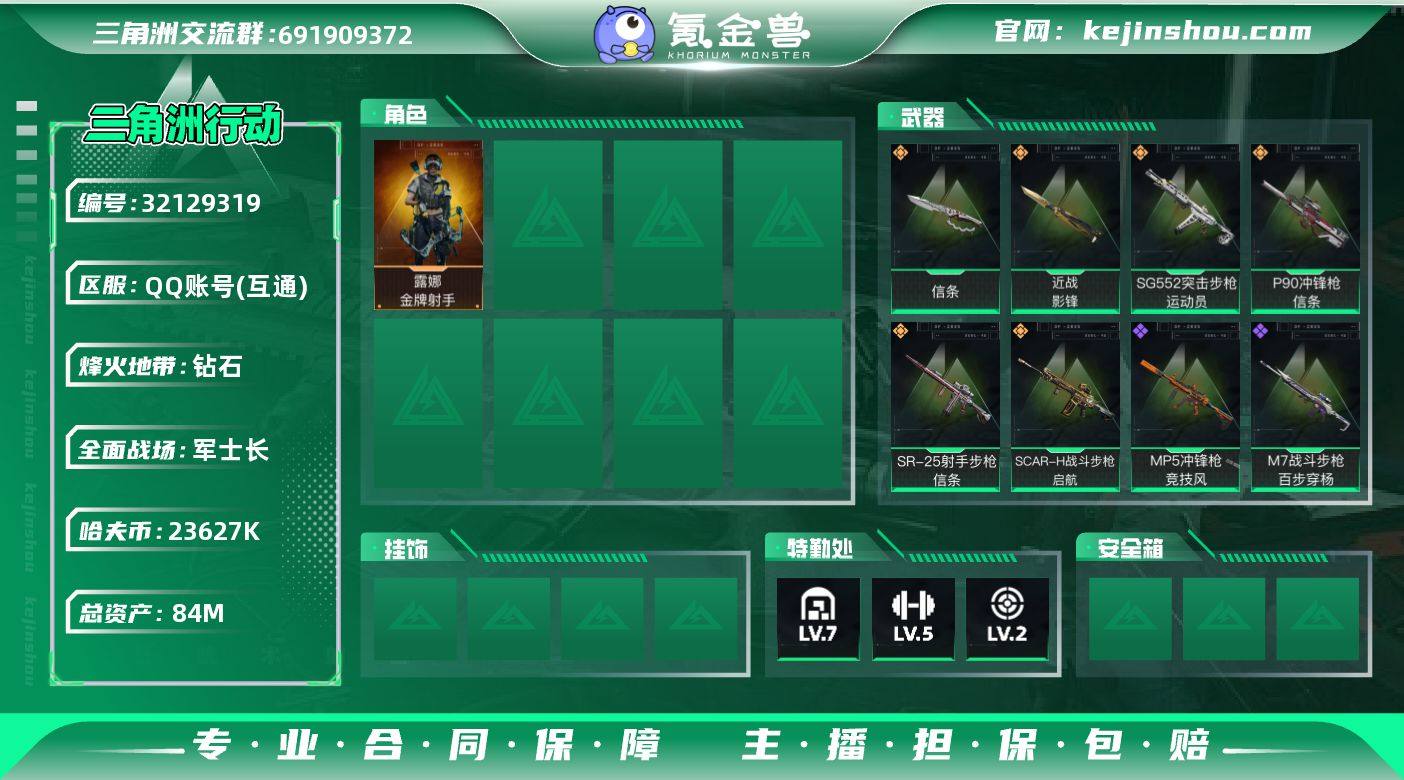 QQD102/可二次/QQ区 【总资产:+84M+近战影锋+近战信条+AW子弹50发】/烽火等级:51级/全面战场:25级/纯币:23627K/三角券加币:90(三角币10+三角券80)【近战-影锋/近战-信条】【露娜-金牌射手】/部门:22221/特勤等级(技术中心1级/工作台3级/制药台1级/防具台3级/仓库7级/指挥中心2级/训练中心5级/靶场2级)P90冲锋枪-信条/SR-25射手步枪-信条/SG552突击步枪-运动员/SCAR-H战斗步枪-启航//橙色挂饰x5/段位:钻石IV(流动资产:75M)详情看图