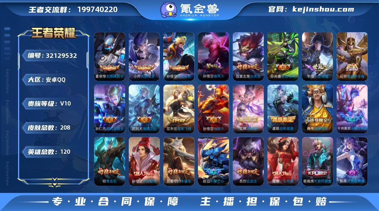 CHC11047,钱包未注销/全限制可排位,安卓Q-V10-荣耀黄金IV段位-120英雄-208皮肤-3典藏皮肤-1典藏英雄-10传说-50史诗 【荣耀典藏】:武则天英雄,孙悟空全息碎影,夏侯惇无限飓风号,小乔天鹅之梦 【传说皮肤】:艾琳觅芳踪,虞姬启明星使,李信一念神魔,百里玄策白虎志,花木兰冠军飞将,后羿黄金射手座,孙尚香末日机甲,孙悟空地狱火,武则天海洋之心,狄仁杰超时空战士 【限定皮肤】:狄仁杰阴阳师,赵云皇家上将,赵云引擎之心,嬴政优雅恋人,嬴政白昼王子,鲁班七号狮舞东方,吕布猎兽之王,夏侯惇朔风刀,曹操烛龙,典韦蓝屏警告,狄仁杰魔术师,狄仁杰万华元夜,达摩沙漠行僧,项羽海滩派对,老夫子醍醐杖,程咬金演武夺筹,露娜一生所爱,兰陵王金庭之子,花木兰瑞麟志,孙悟空大圣娶亲,牛魔御旌,李元芳云中旅人,虞姬启明星使,钟馗神迹守卫,钟馗驱傩正仪,女娲朔望之晖,干将莫邪冰霜恋舞曲,蔡文姬奇迹圣诞,东皇太一逐梦之光,鬼谷子原初探秘者,铠青龙志,苏烈玄武志,苏烈千军破阵,百里玄策白虎志,百里守约朱雀志,弈星混沌棋,沈梦溪大漠名商,明世隐疑决卦,裴擒虎天狼狩猎者,裴擒虎李小龙,裴擒虎擒涛扼浪,狂铁御狮,米莱狄御霄,盾山御銮,鲁班大师探海日志,桑启海盐诗旅,张良古海寻踪,艾琳觅芳踪,鬼谷子天穹祈灯 【年限皮肤】:花木兰瑞麟志,苏烈玄武志,百里玄策白虎志,百里守约朱雀志,铠青龙志 【赛季限定】:曹操烛龙,狂铁御狮,米莱狄御霄,牛魔御旌,盾山御銮,夏侯惇朔风刀,弈星混沌棋,明世隐疑决卦,老夫子醍醐杖,鬼谷子原初探秘者,狄仁杰万华元夜,程咬金演武夺筹,钟馗驱傩正仪,苏烈千军破阵,达摩沙漠行僧,兰陵王金庭之子,沈梦溪大漠名商,李元芳云中旅人,桑启海盐诗旅,裴擒虎擒涛扼浪,鲁班大师探海日志,张良古海寻踪,鬼谷子天穹祈灯 【战令限定】:...