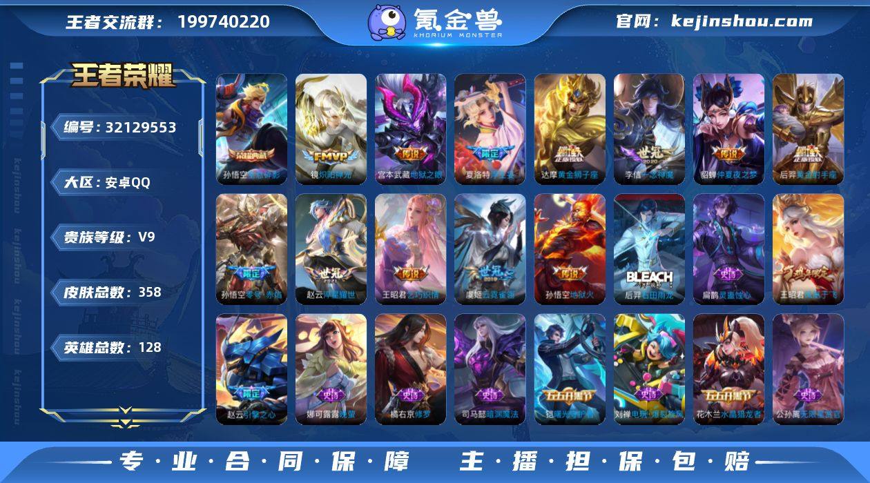V9 2典藏 23传说 128英雄 358皮肤 典藏英雄武则天 可修改实名 男号 【英雄全皮】空空儿全皮,孙权全皮,蚩奼全皮,大禹全皮 【稀有英雄】大司命,嬴政(始皇帝),韩信(韩跳跳),夏洛特(夏师傅),艾琳,橘右京(橘子),娜可露露(鸟人),不知火舞,赵云,金蝉(唐僧),戈娅 【荣耀水晶】九霄神辉(木兰典藏),全息碎影(猴子典藏) 【传说皮】黄金狮子座,黄金射手座,零号·赤焰,地狱火,仲夏夜之梦(大飞蛾),地狱之眼,末日机甲-孙尚香(绿蚂蚱),云霓雀翎,一念神魔,淬星耀世,炽阳神光,乞巧织情,时之恋人-刘备(电焊工),浮生妄 【珍宝阁皮】优雅恋人,女武神,玩趣恶龙 【赛季/战令皮】古海寻踪(s33),星界游侠,海盐诗旅(s30),擒涛扼浪(s31),潮玩骑兵,奇幻香踪,探海日志(s32),驭风魔法,玲珑珍味,流音漫舞,地狱燃心,剑破天穹(s35),天穹祈灯(s34),暖冬·兔眠,妖精王(s5),炼金王(s6),凯尔特女王(s7),狰(s8),饕餮(s9),烛龙(s10),重明(s11),穷奇(s12),御狮(s13),御霄(s14),御旌(s15),御銮(s16),朔风刀(s17),混沌棋(s18),疑决卦(s19),醍醐杖(s20),原初探秘者(s21),万华元夜(s22),演武夺筹(s23),驱傩正仪(s24),千军破阵(s25),猎兽之王,白昼王子,朔望之晖,蓝屏警告,赤莲之焰,驯魔猎人,星空之诺,银河之约,迷踪丽影,单词大作战,狂想玩偶喵,云间偶戏,星际陆战队-达摩,胡桃异想国,圣弓游侠,真爱魔法,火炮绅士,沙漠行僧(s26),幻夜卜梦,金庭之子(s27),大漠名商(s28),云中旅人(s29),超时空战士-钟无艳,落雪兰心 【史诗皮】线条小狗-周瑜,涂山容容,灵蛊蚀心,石田雨龙,紫霞仙子,白龙吟,黄金分割率,特工魅影,千年之狐,蒙恬荣光圣徽,百解令(蒙犽),江河有灵,鹤归松栖(赵怀真),无限星赏官,冰冠公主,偶像歌手,晚萤,龙骑士(小龙虾),白蛇,电玩·爆裂旋风,末日机甲-吕布,猫狗日记-孙策,猫狗日记-大乔,乱世