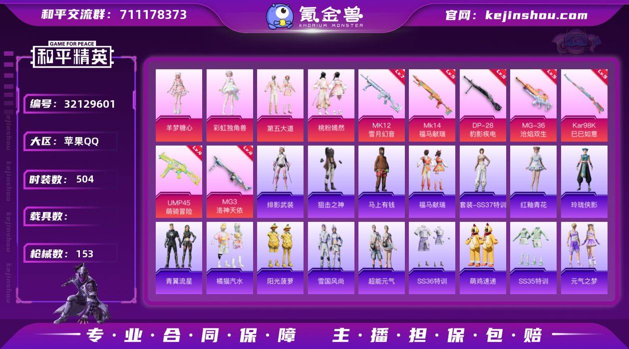 实名:可二次实名 是否支持人脸包赔:不支持 粉装数量:4 特效枪数量:7 时装数:504 枪械数:153 羊梦糖心,彩虹独角兽,第五大道,桃粉嫣然 七级MK12-雪月幻音,五级MK14-福马献瑞,五级DP-28-豹影疾电,五级MG-36-沧焰双生,五级Kar98K-巳巳如意,四级UMP45-萌骑冒险,四级MG3-洛神天依 绯影武装,狙击之神,马上有钱,福马献瑞,红釉青花,SS37特训,雨过天青,玲珑侠影,青翼流星,橘猫汽水,阳光菠萝,雪国风尚,超能元气,SS36特训,萌鸡速递,SS35特训,元气之梦,美羊羊,喜羊羊,薄荷星砂,狂鲨锋刃,凌霄紫焰,擎苍青焰,SS34特训套装,朱霞炽焰,暗金炫舞,冰川特警,缤纷果语,白光莹,滨海厨神,白糯汤圆,白色伏地魔,彩虹兔,长空猛禽,潮流炫酷,顶瓜瓜,蝶变,都市魅力,电音精灵,绯格组合,粉红小猪,疯狂小兔子,粉恋花,龟仙人,光之冒险,海岛探路者,湖蓝色名流,黑色伏地魔,黄色伏地魔,黄色名流,黄色运动,红色运动,幻影武者,绝对偶像,酒红色名流,惊鸿侠骨,橘黑制服,竞技达人朋克,竞技名士,坚韧舞者,极速红龙,街头潮人,街头风暴,锦衣飞扬,快乐星愿,蓝冰羽,蓝彩潮人,蓝海鲸歌,猎鹰,蓝色运动,冷焰舞者,Mark.06,猛禽,魅力单车,柠萌假日,破蛋小黄鸡,破晓战魂,绮丽涂鸦,青年教官,青涩时光,青玉碎影,云朵鹅,绒宝小鹅,荣耀,人气偶像,深蓝色名流,SS21特训,SS22特训,SS23特训,SS24特训,SS25特训,SS28特训,SS29特训,SS30特训套装,SS31特训套装,SS32特训套装,SS33特训套装,巳巳如意,甜蜜告白,涂山之恋,特训学院,童真绒兔,特战装甲,完美偶像,王牌教练,迅捷狂鲨,雪绒豹,旭日情侣,夏日倾情,星途旅人,耀粉歌者,银尘,野性战心,鱼渊荷华,耀眼新星,燕燕于飞,异域银装,战地督导,智谋强哥,自由猎手,紫幽梦,灼焰舞者 绝对恒星飞行器,月下星之子飞行器,喜羊羊与灰太狼降落伞,无垠阁降落伞,冷漠罗丽降落伞,洛神天依降落伞,千金淑猫降落伞,时光之誓降落伞,未来歌姬降落伞,未来领航者降落伞,音爆索尼克降落伞,荧海星豚降落伞,智耀战神降落伞 卖家说:可议价