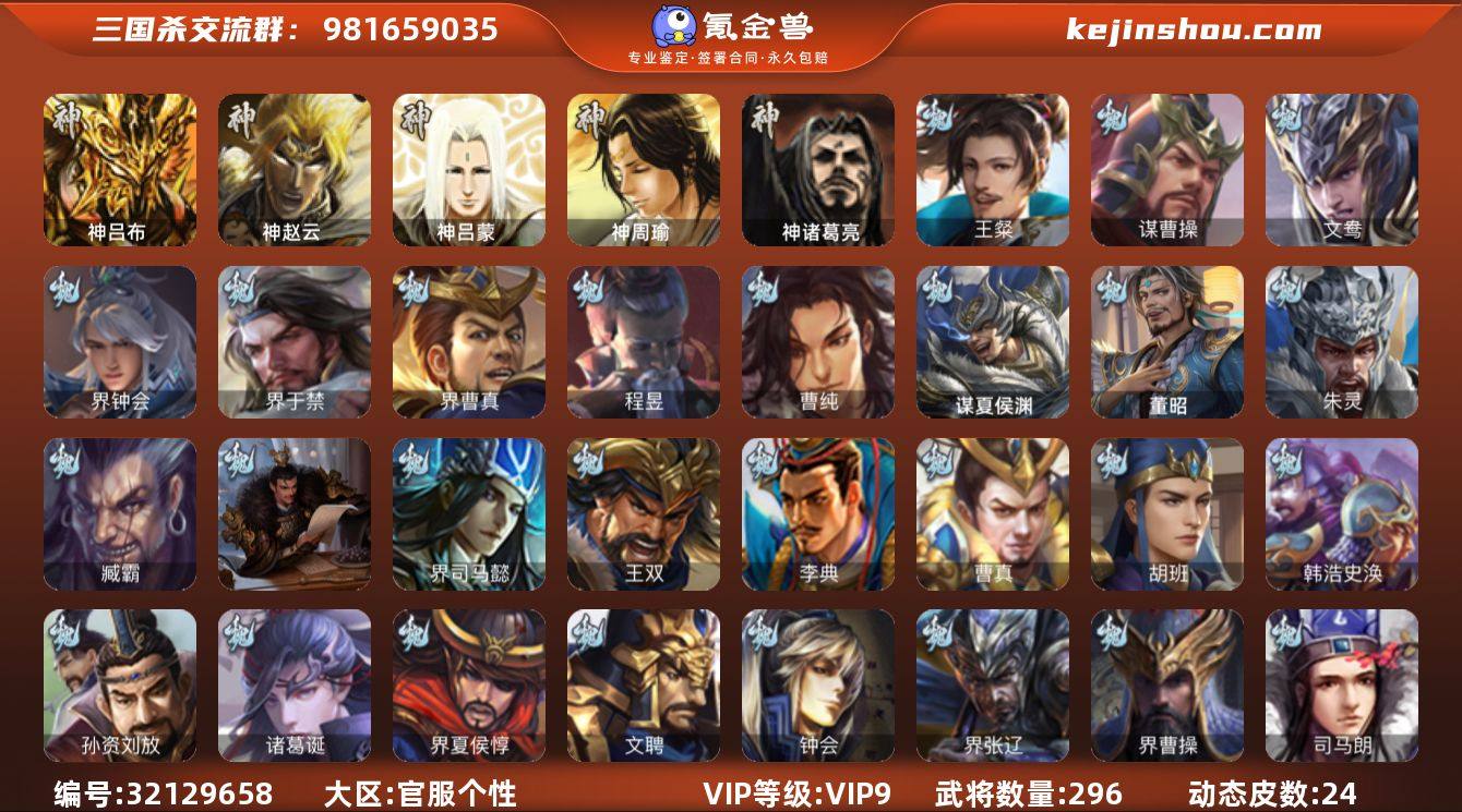 官阶: 骠骑将军 VIP等级: VIP9 武将数量: 296 动态皮肤数量: 24 神将: 神吕布,神赵云,神吕蒙,神周瑜,神诸葛亮 魏国武将: 曹纯,程昱,界曹真,界于禁,界钟会,文鸯,谋曹操,王粲,唐咨-魏,张辽,SP蔡文姬,SP曹仁,SP关羽,SP姜维,SP庞德,卞夫人,曹昂,曹操,曹冲,曹洪,曹丕,曹仁,曹叡,王异,张恭,鲁芝,界曹植,满宠,荀攸,钟繇,郭嘉,荀彧,杜畿,界郭嘉,崔琰,界荀彧,朱灵,吕虔,界王异,界许褚,界郭淮,华歆,陈群,谋甄姬,袁涣,李通,乐进,辛宪英,郭淮,夏侯惇,曹植,司马朗,谋于禁,界曹操,许褚,界张辽,张郃,钟会,文聘,曹彰,界夏侯惇,诸葛诞,司马懿,甄姬,徐晃,孙资刘放,韩浩史涣,胡班,曹真,典韦,夏侯渊,李典,于禁,王双,邓艾,界司马懿,孟达-魏,臧霸,朱灵(国战),董昭,谋夏侯渊 蜀国武将: 花鬘,傅佥,赵襄,谋马超,谋赵云,徐庶,谋刘备,界关羽,界诸葛亮,费祎,界黄月英,赵云,张松,彭羕,界刘备,界刘禅,刘封,谋庞统,黄月英,关羽,吴懿,界廖化,祝融,张飞,黄皓,陈震,魏延,界周仓,马忠,界法正,糜夫人,刘禅,界赵云,谋诸葛亮,张翼,关银屏,SP孙尚香,SP徐庶,卧龙诸葛,宗预,周仓,简雍,界关兴张苞,诸葛亮,界张飞,法正,赵统赵广,陈到,界马岱,关平,马岱,界庞统,庞统,诸葛果,谋张飞,马谡,马超,廖化,关兴张苞,孟获,夏侯氏,姜维,黄忠,刘备,界马超,李严,马良,蒋琬费祎,刘谌,彭羕(国战),甘夫人 吴国武将: 界徐盛,吴景,文鸯,界朱桓,潘濬,张温,周泰,全琮,吕蒙,诸葛恪,界孙尚香,大乔小乔,谋甘宁,谋周瑜,谋吕蒙,孙茹,蒋钦,顾雍,界朱治,孙休,严畯,界孙权,孙翊,界孙休,界凌统,界虞翻,界吕蒙,孙登,凌操,朱治,孙尚香,程普,大乔,韩当,陆逊,诸葛瑾,朱然,吕范,太史慈,谋大乔,虞翻,界黄盖,孙鲁班,界周瑜,孙权,界孙鲁班,谋小乔,界甘宁,吴国太,甘宁,界大乔,孙坚,孙鲁育,凌统,步练师,周瑜,小乔,潘璋马忠,黄盖,孙策,界陆逊,界周泰,界吴国太,吴-唐咨,谋韩当,徐盛,张昭张纮,陈武蕫袭,朱...