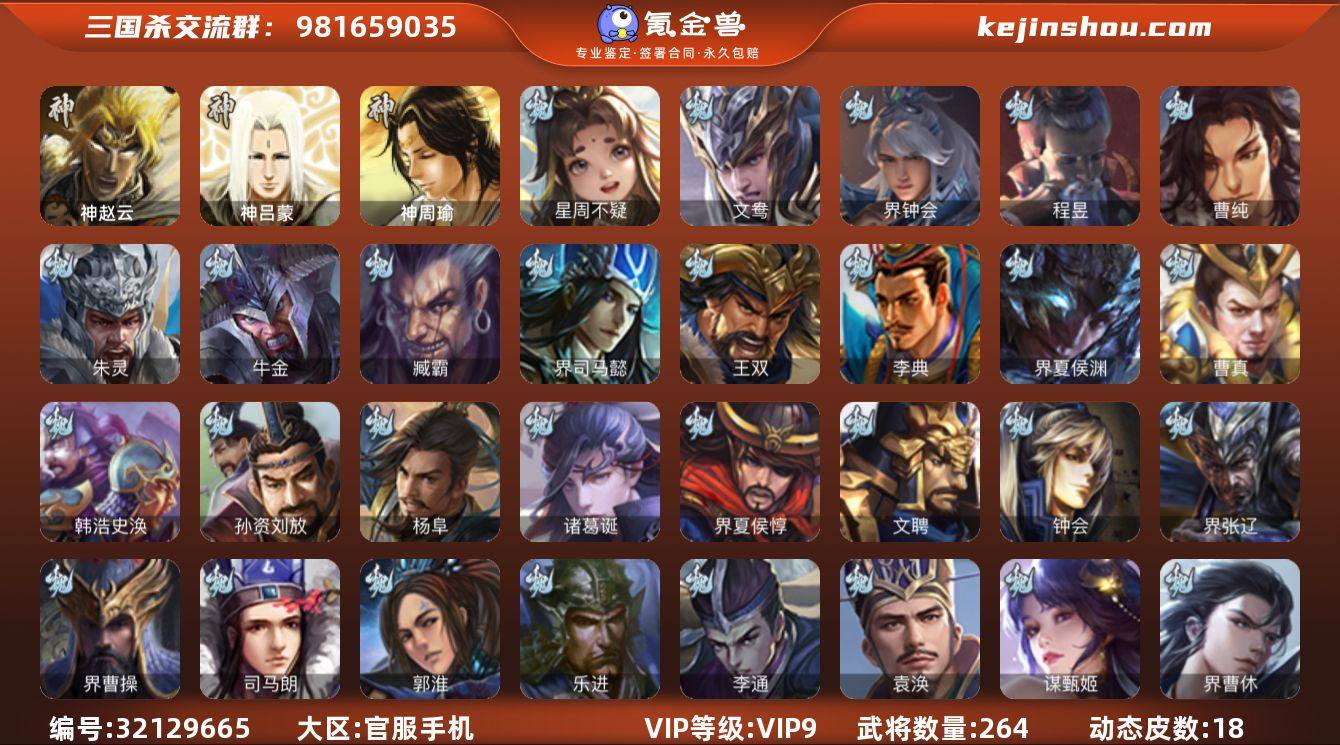官阶: 骠骑将军 VIP等级: VIP9 武将数量: 264 动态皮肤数量: 18 神将: 神赵云,神吕蒙,神周瑜 魏国武将: 曹纯,程昱,界钟会,文鸯,张辽,SP蔡文姬,SP关羽,SP贾诩,SP姜维,SP庞德,曹昂,曹操,曹冲,曹洪,曹丕,曹仁,曹叡,王异,鲁芝,曹休,界曹植,满宠,荀攸,钟繇,郭嘉,荀彧,杜畿,界郭嘉,崔琰,界曹丕,界荀彧,朱灵,吕虔,界王异,界许褚,界郭淮,陈群,界曹休,谋甄姬,袁涣,李通,乐进,郭淮,夏侯惇,司马朗,界曹操,星周不疑,许褚,界张辽,谋徐晃,张郃,钟会,文聘,曹彰,界夏侯惇,诸葛诞,司马懿,甄姬,杨阜,徐晃,孙资刘放,韩浩史涣,曹真,典韦,界夏侯渊,夏侯渊,李典,于禁,王双,邓艾,界司马懿,臧霸,牛金,朱灵(国战) 蜀国武将: 花鬘,谯周,谋赵云,谋夏侯氏,徐庶,杨仪,吕凯,界关羽,邓芝,界伊籍,界黄月英,赵云,张松,彭羕,李丰,界刘备,谋姜维,刘封,糜竺,谋庞统,黄月英,关羽,吴懿,吴班,祝融,张飞,黄皓,魏延,界周仓,界法正,糜夫人,刘禅,界赵云,谋诸葛亮,SP孙尚香,SP徐庶,卧龙诸葛,周仓,简雍,界关兴张苞,诸葛亮,界张飞,界卧龙诸葛,法正,陈到,界马岱,关平,马岱,庞统,诸葛果,谋张飞,马谡,马超,廖化,关兴张苞,孟获,夏侯氏,姜维,黄忠,刘备,界马超,马良,蒋琬费祎,刘谌,彭羕(国战),甘夫人,SP甘夫人 吴国武将: 界徐盛,孙寒华,文鸯,潘濬,张温,周泰,吕蒙,诸葛恪,界孙尚香,丁奉,谋吕蒙,界全琮,孙茹,顾雍,孙亮,界朱治,孙休,严畯,界孙权,祖茂,濮阳兴,界虞翻,界吕蒙,孙登,凌操,朱治,谋黄盖,孙尚香,程普,大乔,韩当,陆逊,诸葛瑾,朱然,吕范,太史慈,虞翻,界黄盖,孙鲁班,界周瑜,卫温诸葛直,孙权,界甘宁,吴国太,甘宁,界大乔,孙坚,孙鲁育,岑昏,步练师,周瑜,小乔,潘璋马忠,黄盖,吕岱,孙策,界陆逊,界吴国太,徐盛,张昭张纮,陈武蕫袭,朱桓 群国武将: 界李儒,界左慈,沮授,兀突骨,星黄忠,左慈,伏完,刘协,华雄,袁术,高顺,界庞德,于吉,界公孙瓒,吕布,李儒,公孙瓒,SP赵云,王濬,蔡夫...