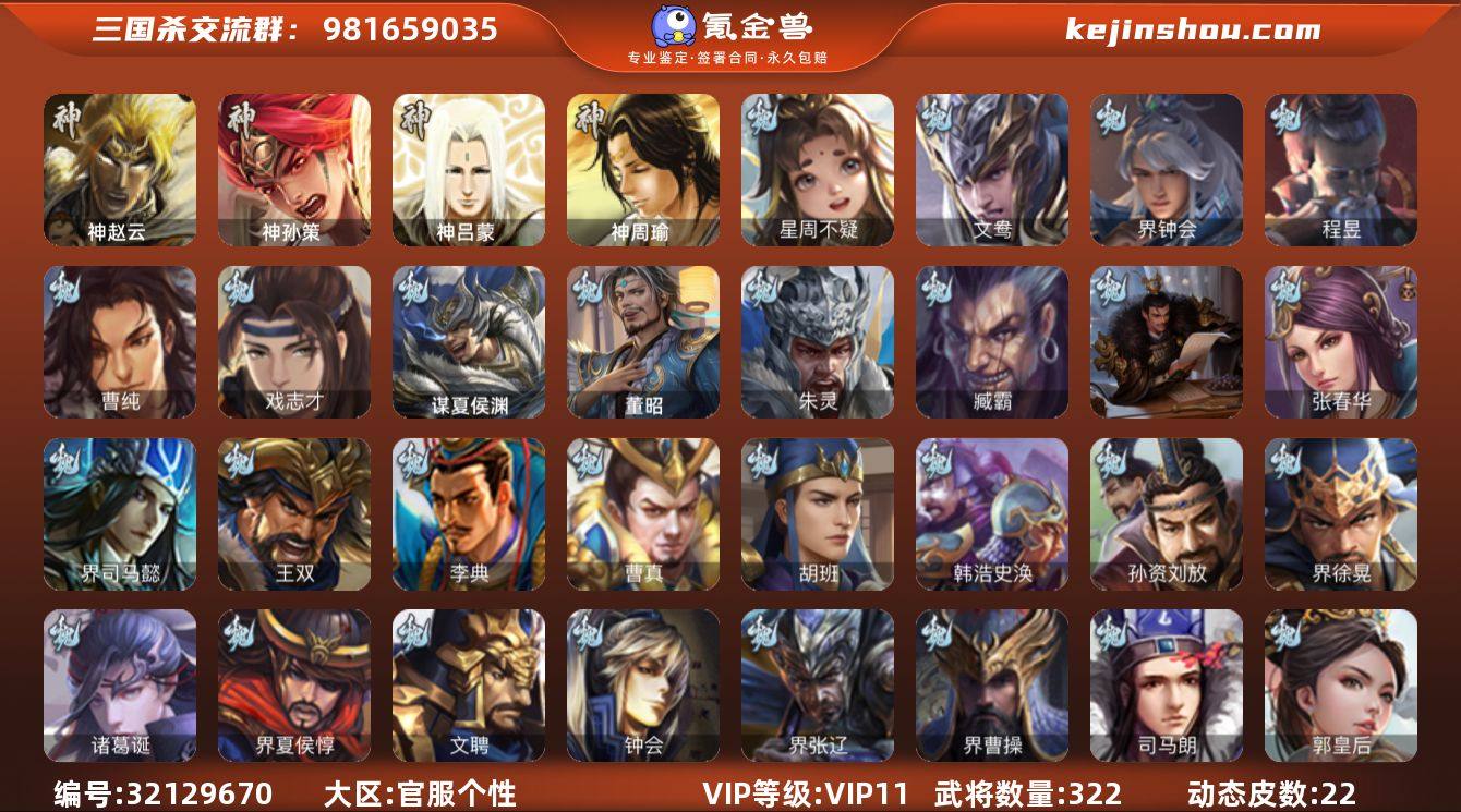 官阶: 骠骑将军 VIP等级: VIP11 武将数量: 322 动态皮肤数量: 22 神将: 神孙策,神赵云,神吕蒙,神周瑜 魏国武将: 戏志才,曹纯,程昱,界钟会,文鸯,唐咨-魏,张辽,SP蔡文姬,SP关羽,SP贾诩,SP姜维,SP庞德,卞夫人,曹昂,曹操,曹冲,曹洪,曹丕,曹仁,曹叡,王异,鲁芝,曹休,界曹植,满宠,荀攸,王基,钟繇,蒯越蒯良,郭嘉,荀彧,杜畿,界郭嘉,崔琰,界曹丕,界荀彧,朱灵,界甄姬,吕虔,界王异,界许褚,界郭淮,华歆,陈群,袁涣,乐进,郭淮,郭皇后,夏侯惇,曹植,司马朗,谋于禁,界曹操,星周不疑,许褚,界张辽,谋徐晃,钟会,文聘,曹彰,界夏侯惇,诸葛诞,司马懿,甄姬,界徐晃,徐晃,孙资刘放,韩浩史涣,胡班,曹真,典韦,夏侯渊,李典,于禁,王双,邓艾,界司马懿,张春华,孟达-魏,臧霸,朱灵(国战),董昭,谋夏侯渊 蜀国武将: 董允,花鬘,谯周,沙摩柯,赵襄,谋马超,谋赵云,谋黄月英,徐庶,杨仪,界关羽,界伊籍,费祎,严颜,界张嶷,赵云,张松,彭羕,李丰,界刘备,谋法正,界刘禅,刘封,糜竺,李遗,谋庞统,黄月英,刘巴,关羽,王甫赵累,吴懿,吴班,向宠,祝融,张飞,黄皓,魏延,谋祝融,马忠,界法正,糜夫人,刘禅,界赵云,谋诸葛亮,界姜维,张翼,关银屏,SP孙尚香,SP徐庶,卧龙诸葛,周仓,简雍,谋孟获,界关兴张苞,诸葛亮,界张飞,法正,赵统赵广,陈到,界马岱,关平,马岱,界庞统,庞统,诸葛果,谋张飞,马谡,马超,廖化,关兴张苞,孟获,夏侯氏,姜维,黄忠,刘备,界马超,李严,马良,蒋琬费祎,刘谌,彭羕(国战),甘夫人,蜀-糜芳傅士仁,SP甘夫人 吴国武将: 界徐盛,骆统,文鸯,潘濬,周泰,全琮,吕蒙,诸葛恪,界孙尚香,大乔小乔,谋周瑜,许贡,丁奉,界全琮,孙茹,蒋钦,顾雍,阚泽,孙休,严畯,界孙权,孙翊,界孙休,祖茂,濮阳兴,界吕蒙,孙登,凌操,朱治,孙尚香,程普,大乔,韩当,陆逊,诸葛瑾,朱然,吕范,太史慈,谋大乔,周妃,虞翻,界孙坚,界黄盖,孙鲁班,界周瑜,孙权,界孙鲁班,谋小乔,界小乔,鲁肃,界甘宁,界韩当,吴国太,甘宁,界大...