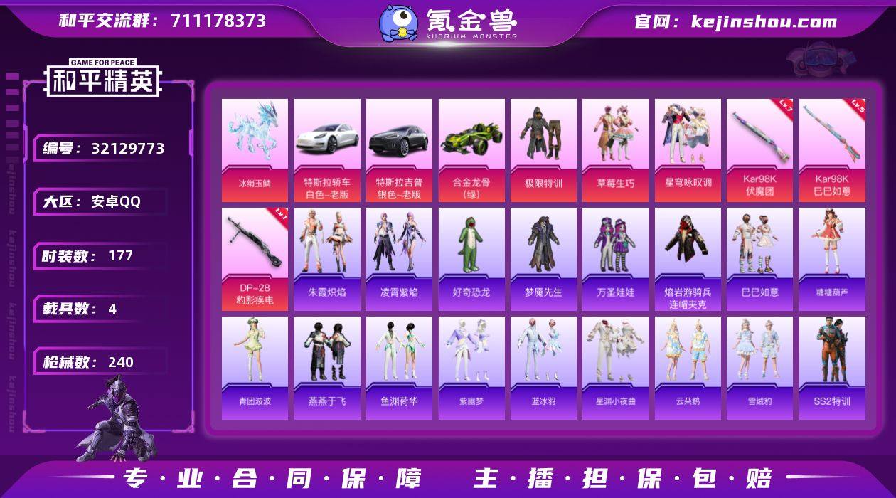 安卓 手Q-3粉装-3特效枪-4载具-1粉色飞行器-70467热力值-15王牌印记-177套装-240枪皮【热门品类】:旭日初心兜帽大衣,熔岩游骑兵连帽夹克【粉色套装】:粉装-极限特训,粉装-草莓生巧,粉装-星穹咏叹调【粉色枪皮等级】:Kar98K-伏魔团(七级),Kar98K-巳巳如意(五级),DP-28-豹影疾电(一级)【粉色载具】:特斯拉Model 3(珍珠白),特斯拉Model X(冷光银),合金龙骨(绿),冰绡玉鳞【粉色枪皮】:Kar98K-伏魔团,Kar98K-巳巳如意,DP-28-豹影疾电【粉色飞行器】:灵珠游龙飞行器