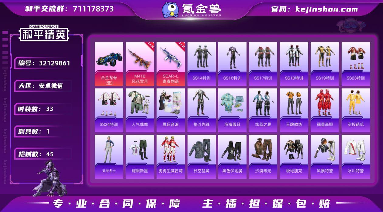 安卓 微信-0粉装-2特效枪-1载具-0粉色飞行器-16272热力值-4王牌印记-33套装-45枪皮【粉色枪皮等级】:SCAR-L-青春物语(二级),M416-风花雪月(五级【粉色载具】:合金龙骨(蓝)【粉色枪皮】:SCAR-L-青春物语,M416-风花雪月