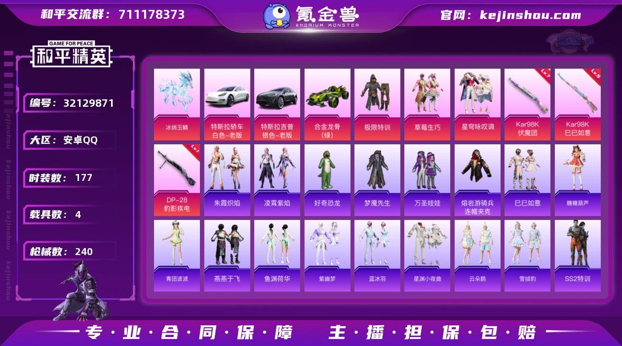 安卓 手Q-3粉装-3特效枪-4载具-1粉色飞行器-70467热力值-15王牌印记-177套装-240枪皮【热门品类】:旭日初心兜帽大衣,熔岩游骑兵连帽夹克【粉色套装】:粉装-极限特训,粉装-草莓生巧,粉装-星穹咏叹调【粉色枪皮等级】:Kar98K-伏魔团(七级),Kar98K-巳巳如意(五级),DP-28-豹影疾电(一级)【粉色载具】:特斯拉Model 3(珍珠白),特斯拉Model X(冷光银),合金龙骨(绿),冰绡玉鳞【粉色枪皮】:Kar98K-伏魔团,Kar98K-巳巳如意,DP-28-豹影疾电【粉色飞行器】:灵珠游龙飞行器