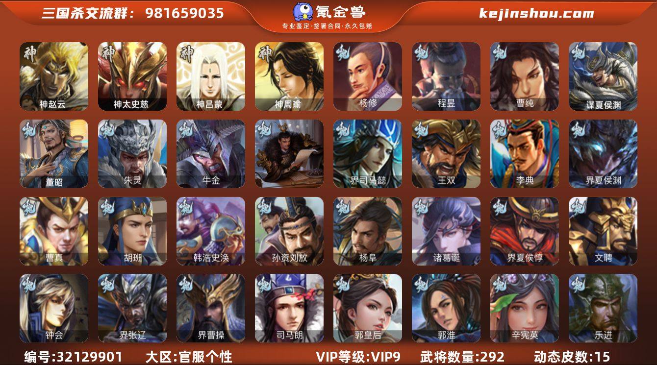 官阶: 骠骑将军 VIP等级: VIP9 武将数量: 292 动态皮肤数量: 15 神将: 神太史慈,神赵云,神吕蒙,神周瑜 魏国武将: 曹纯,程昱,杨修,唐咨-魏,张辽,SP曹仁,SP关羽,SP贾诩,SP姜维,卞夫人,曹昂,曹操,曹冲,曹洪,曹丕,曹仁,曹叡,王异,张恭,鲁芝,界满宠,曹休,界曹植,满宠,荀攸,钟繇,郭嘉,荀彧,阮慧,杜畿,界郭嘉,崔琰,界曹丕,界荀彧,朱灵,吕虔,界王异,界许褚,陈群,界曹休,袁涣,乐进,辛宪英,郭淮,郭皇后,夏侯惇,司马朗,谋于禁,界曹操,许褚,界张辽,谋徐晃,张郃,钟会,文聘,曹彰,界夏侯惇,诸葛诞,司马懿,甄姬,杨阜,徐晃,孙资刘放,韩浩史涣,胡班,曹真,典韦,界夏侯渊,夏侯渊,李典,于禁,王双,邓艾,界司马懿,孟达-魏,牛金,朱灵(国战),董昭,谋夏侯渊 蜀国武将: 董允,花鬘,诸葛瞻,谋赵云,谋夏侯氏,徐庶,杨仪,界关羽,邓芝,界伊籍,费祎,严颜,界张嶷,赵云,张松,彭羕,李丰,界刘备,界刘禅,刘封,黄月英,刘巴,关羽,吴懿,吴班,祝融,张飞,黄皓,魏延,界法正,糜夫人,界孟获,刘禅,界赵云,谋诸葛亮,界姜维,张翼,关银屏,界祝融,SP孙尚香,SP徐庶,卧龙诸葛,周仓,简雍,界关兴张苞,诸葛亮,界张飞,界卧龙诸葛,法正,赵统赵广,陈到,界马岱,关平,马岱,庞统,诸葛果,谋张飞,马谡,马超,廖化,关兴张苞,孟获,姜维,黄忠,刘备,界马超,李严,马良,刘谌,彭羕(国战),甘夫人,势陈到 吴国武将: 界徐盛,界朱然,骆统,周处,张温,周泰,全琮,吕蒙,界孙尚香,大乔小乔,许贡,丁奉,谋吕蒙,孙茹,蒋钦,顾雍,孙亮,界朱治,孙休,严畯,界孙权,孙翊,濮阳兴,界虞翻,孙登,凌操,孙尚香,程普,大乔,韩当,陆逊,诸葛瑾,朱然,太史慈,虞翻,界黄盖,孙鲁班,界周瑜,界潘璋马忠,卫温诸葛直,孙权,界小乔,界甘宁,吴国太,甘宁,界大乔,孙坚,孙鲁育,凌统,岑昏,步练师,周瑜,小乔,潘璋马忠,黄盖,吕岱,孙策,界陆逊,界周泰,界吴国太,吴-唐咨,徐盛,张昭张纮,孙邵,朱桓 群国武将: 界左慈,刘焉,兀突骨,郑玄,左慈,伏完...
