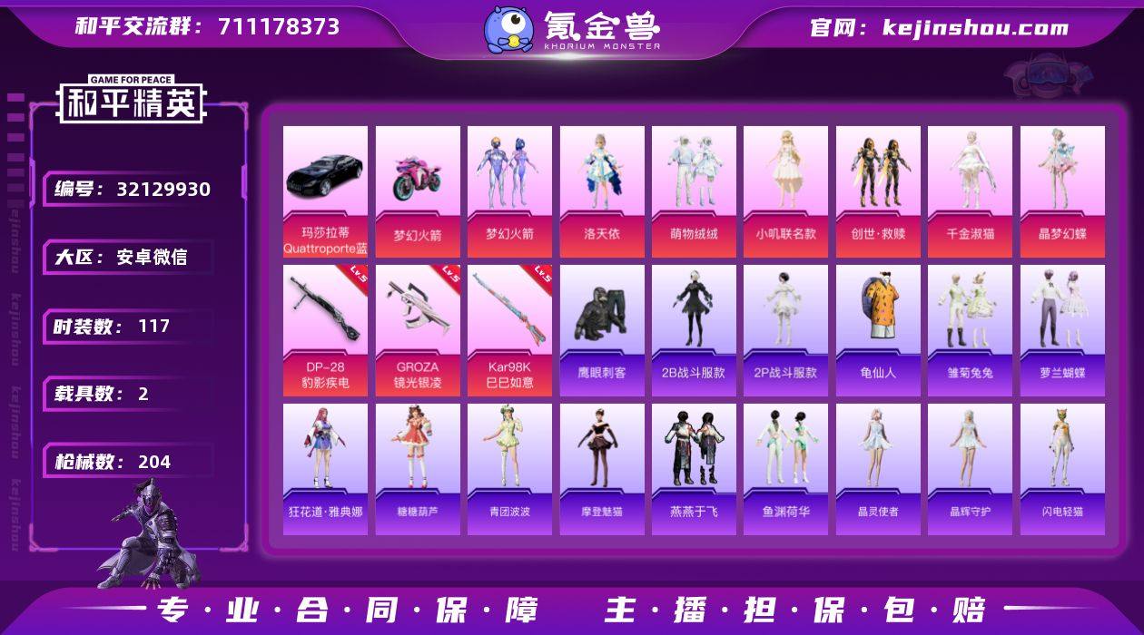 安卓 微信-11粉装-6特效枪-2载具-4粉色飞行器-60500热力值-11王牌印记-117套装-204枪皮 【热门品类】:粉装-梦幻火箭,角色-2B战斗服款,角色-2P战斗服款,套装-龟仙人 【粉色套装】:粉装-梦幻火箭,角色-洛天依,粉装-萌物绒绒,角色-小叽联名款,套装-创世·救赎,角色-千金淑猫,角色-晶梦幻蝶,人物-小舞,人物-小舞·灵珑,人物-小舞·雪昙,人物-小舞·恋语 【粉色枪皮等级】:GROZA-镜光银凌(五级),ACE32-萌骑漫游(五级),AKS-74U-森灵之息(五级),Kar98K-巳巳如意(五级),Mk14-福马献瑞(五级),DP-28-豹影疾电(五级) 【粉色载具】:玛莎拉蒂Quattroporte(夜幕蓝),双人摩托-梦幻火箭 【粉色枪皮】:GROZA-镜光银凌,ACE32-萌骑漫游,AKS-74U-森灵之息,Kar98K-巳巳如意,Mk14-福马献瑞,DP-28-豹影疾电 【粉色飞行器】:梦幻火箭飞行器,仙剑飞行器,镜光幻境飞行翼,小舞飞行器 【粉色降落伞】:至尊龙雀降落伞,梦幻火箭降落伞,暗夜玫瑰降落伞,洛神天依降落伞,太空嘟嘟降落伞,天星战神降落伞,炫光之旅降落伞,小叽联名款降落伞,蜜语绒猫降落伞,精灵梦叶罗丽降落伞,拳皇·狂花道降落伞,英伦信使降落伞,晶梦幻蝶降落伞,桃粉嫣然降落伞,罪夜之冕降落伞,小舞降落伞 【稀有套装】:套装-龟仙人,套装-马上来财,套装-大漠长歌,套装-雏菊兔兔,套装-萝兰蝴蝶,角色-狂花道·雅典娜,套装-糖糖葫芦,套装-青团波波,角色-摩登魅猫,套装-燕燕于飞,套装-鱼渊荷华,套装-晶灵使者,套装-晶辉守护,套装-闪电轻猫,套装-雨过天青,套装-红釉青花,角色-幽雨猫猫 【稀有枪皮】:AKM-灼热熔岩,AKM-生命誓言,AKM-破晓战魂,AKM-虎虎生威,AKM-霓虹街区,AKM-龙的传人,M16A4-天使羽翼,M16A4-幻世战舞者,M16A4-红色方程式,M16A4-蓝色火焰,SCAR-L-炫彩节奏,SCAR-L-玉兔迎春,SCAR-L-甜蜜旋律,SCAR...