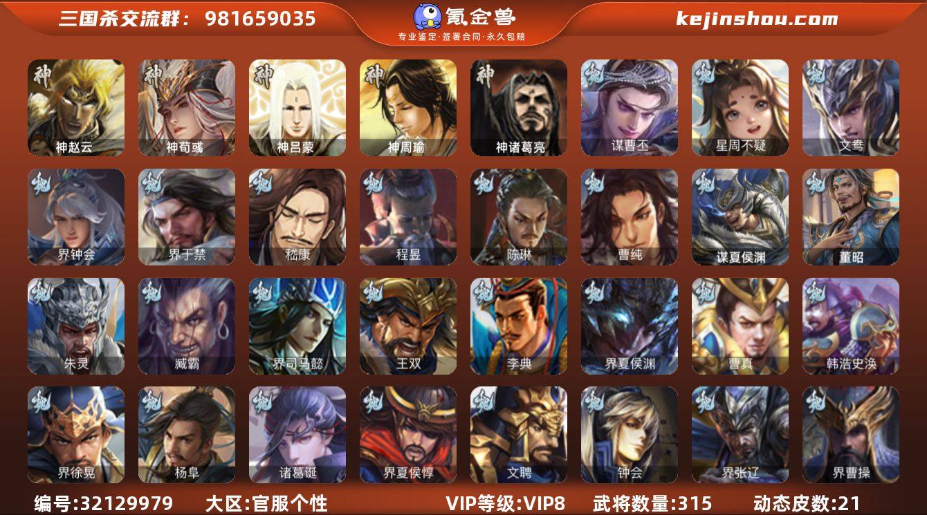 官阶: 骠骑将军 VIP等级: VIP8 武将数量: 315 动态皮肤数量: 21 神将: 神荀彧,神赵云,神吕蒙,神周瑜,神诸葛亮 魏国武将: 曹纯,陈琳,程昱,嵇康,界于禁,界钟会,文鸯,张辽,SP蔡文姬,SP曹仁,SP关羽,SP贾诩,SP姜维,卞夫人,曹昂,曹操,曹冲,曹洪,曹丕,曹仁,曹叡,贾逵,王异,鲁芝,曹休,界曹植,满宠,荀攸,王基,钟繇,蒯越蒯良,郭嘉,牵招,荀彧,阮慧,杜畿,界郭嘉,崔琰,界曹丕,界荀彧,朱灵,界王异,界郭淮,华歆,陈群,界典韦,界曹休,袁涣,李通,乐进,辛宪英,郭淮,郭皇后,夏侯惇,曹植,司马朗,谋于禁,界曹操,星周不疑,许褚,界张辽,谋徐晃,张郃,钟会,文聘,曹彰,界夏侯惇,诸葛诞,司马懿,甄姬,杨阜,界徐晃,徐晃,韩浩史涣,曹真,谋曹丕,典韦,界夏侯渊,夏侯渊,李典,于禁,王双,邓艾,界司马懿,臧霸,朱灵(国战),董昭,谋夏侯渊 蜀国武将: 花鬘,谯周,诸葛瞻,谋马超,谋赵云,谋黄忠,徐庶,界魏延,杨仪,吕凯,界关羽,界诸葛亮,邓芝,界伊籍,费祎,界黄月英,界张嶷,赵云,张松,彭羕,界刘备,界刘禅,刘封,糜竺,黄月英,关羽,吴懿,祝融,张飞,魏延,界周仓,界法正,糜夫人,刘禅,界赵云,谋诸葛亮,界姜维,关银屏,界祝融,SP孙尚香,SP徐庶,卧龙诸葛,周仓,简雍,界关兴张苞,诸葛亮,界张飞,界卧龙诸葛,法正,赵统赵广,陈到,界马岱,关平,马岱,界庞统,庞统,诸葛果,谋张飞,马谡,马超,廖化,关兴张苞,孟获,夏侯氏,姜维,黄忠,刘备,界马超,马良,蒋琬费祎,刘谌,彭羕(国战),甘夫人,SP甘夫人,势陈到 吴国武将: 界徐盛,骆统,文鸯,张温,周泰,全琮,吕蒙,诸葛恪,界孙尚香,大乔小乔,桥公,丁奉,谋吕蒙,孙茹,蒋钦,顾雍,阚泽,孙亮,界朱治,孙休,严畯,界孙权,界孙休,祖茂,濮阳兴,界虞翻,界吕蒙,凌操,朱治,孙尚香,程普,大乔,韩当,陆逊,诸葛瑾,朱然,吕范,太史慈,周妃,虞翻,界孙坚,界黄盖,孙鲁班,界周瑜,界潘璋马忠,卫温诸葛直,孙权,界孙鲁班,界小乔,界甘宁,吴国太,甘宁,界大乔,孙坚,孙鲁育,步练...