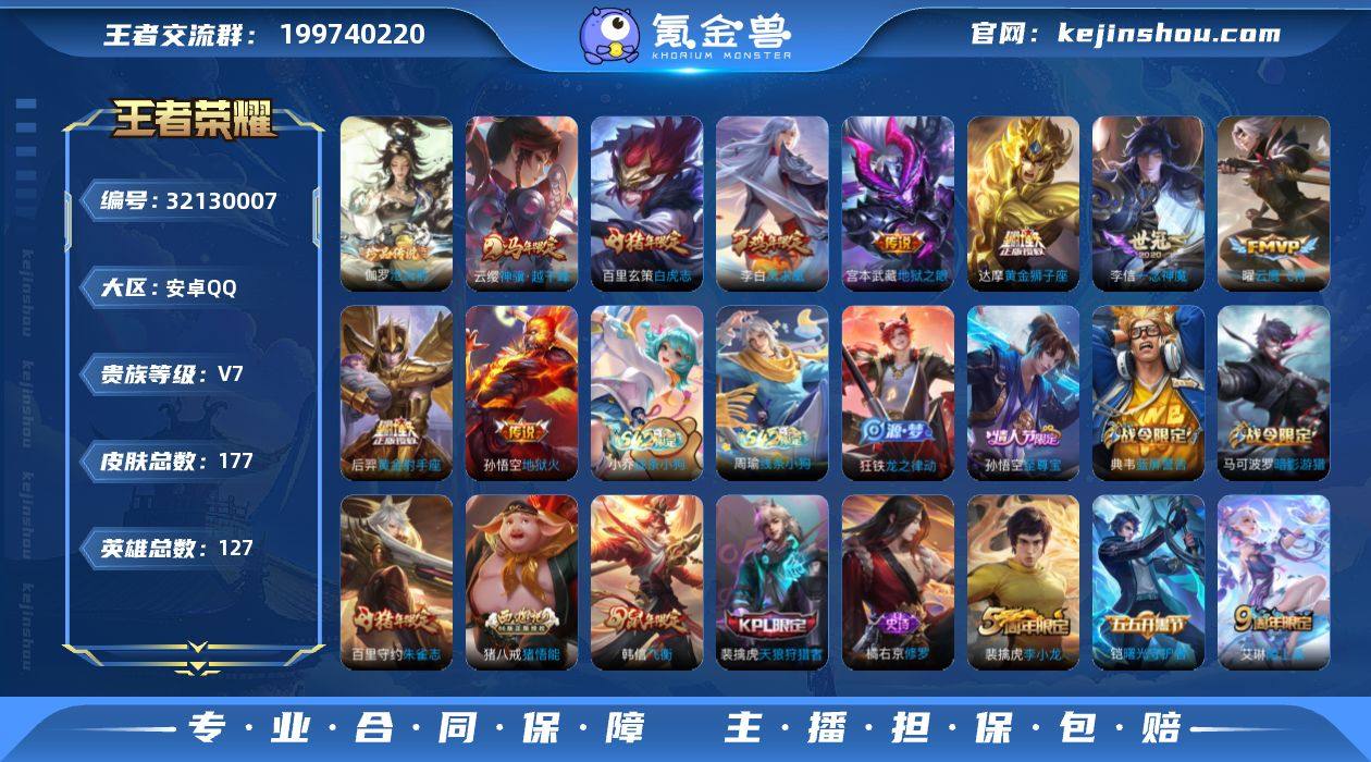 贵族等级:V7 典藏皮肤数:0 珍品无双皮肤数:0 无双皮肤数:0 珍品传说皮肤数:1 传说皮肤数:9 史诗皮肤数:43 皮肤数:177 英雄数:127 段位:无双王者 卖家说:正式服历史双大国服典韦艾琳双小国阿轲兰陵王一堆热门金标装杯号