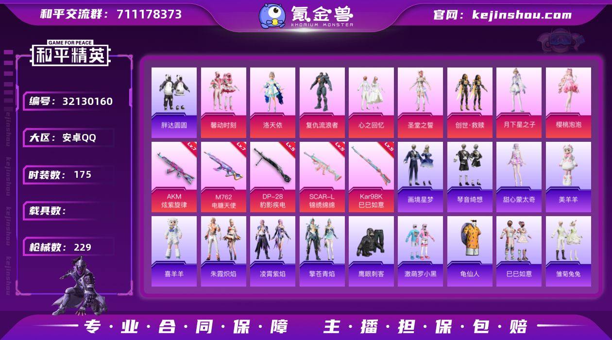 安卓 手Q-8粉装-5特效枪-0载具-2粉色飞行器-70029热力值-14王牌印记-175套装-229枪皮 【热门品类】:套装-胖达圆圆,套装-龟仙人 【粉色套装】:粉装-馨动时刻,角色-洛天依,角色-复仇流浪者,粉装-心之回忆,角色-圣堂之誓,套装-创世·救赎,角色-月下星之子,角色-樱桃泡泡 【粉色枪皮等级】:AKM-炫紫旋律(七级),SCAR-L-锦绣绵绵(五级),M762-电糖天使(七级),Kar98K-巳巳如意(五级),DP-28-豹影疾电(五级) 【粉色枪皮】:AKM-炫紫旋律,SCAR-L-锦绣绵绵,M762-电糖天使,Kar98K-巳巳如意,DP-28-豹影疾电 【粉色飞行器】:炫彩糖果飞行器,天之羽翼飞行器 【粉色降落伞】:绝对恒星降落伞,暗夜玫瑰降落伞,洛神天依降落伞,第五大道降落伞,炫光之旅降落伞,圣堂之誓降落伞,金丰海韵降落伞,千金淑猫降落伞,彩虹独角兽降落伞,喜羊羊与灰太狼降落伞,炫彩糖果降落伞,暮色玫影降落伞 【稀有套装】:套装-龟仙人,套装-巳巳如意,角色-甜心蒙太奇,套装-雪国风尚,套装-炫彩糖果,套装-雏菊兔兔,套装-萝兰蝴蝶,套装-糖糖葫芦,套装-青团波波,套装-棉花软糖,角色-都市丽猫,角色-摩登魅猫,套装-燕燕于飞,套装-鱼渊荷华,套装-粉恋花,套装-紫幽梦,套装-蓝冰羽,套装-星渊小夜曲,套装-彩虹兔,套装-云朵鹅,套装-雪绒豹,套装-朱霞炽焰,套装-凌霄紫焰,套装-擎苍青焰,玩偶服-美羊羊,玩偶服-喜羊羊,套装-画境星梦,套装-琴音绮想 【稀有枪皮】:AUG-冰晶雪宝,AKM-彩虹符号,AKM-破晓战魂,AKM-虎虎生威,AKM-霓虹街区,AKM-龙的传人,M16A4-幻世战舞者,M16A4-红色方程式,M16A4-蓝色火焰,M16A4-千金淑猫,SCAR-L-炫彩节奏,SCAR-L-玉兔迎春,SCAR-L-红色方程式,M416-糯团青竹,M416-红色方程式,M416-绯红前夜,M416-蓝色火焰,GROZA-懵萌河马,GROZA-田园牧歌,GROZA-黑色刀锋,AUG-耀粉歌...