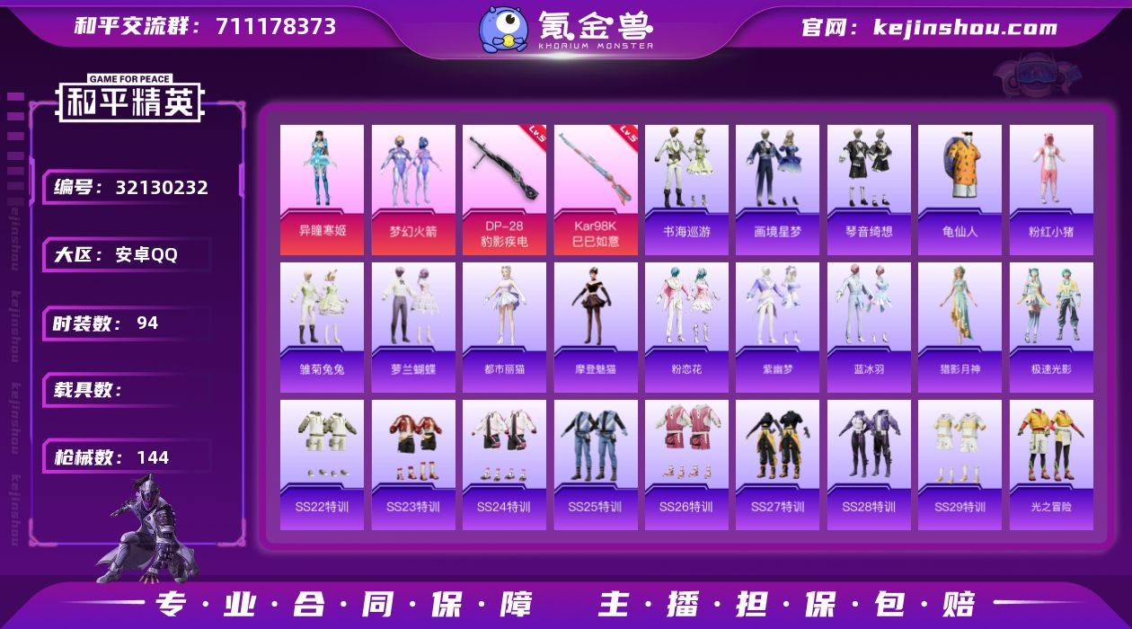 精品号2粉4特 梦幻火箭 安卓 手Q-2粉装-4特效枪-0载具-0粉色飞行器-37571热力值-2王牌印记-94套装-144枪皮 【热门品类】:粉装-梦幻火箭,套装-龟仙人,套装-粉红小猪 【粉色套装】:粉装-梦幻火箭,角色-异瞳寒姬 【粉色枪皮等级】:UMP45-萌骑冒险(五级),AKS-74U-森灵之息(五级),Kar98K-巳巳如意(五级),DP-28-豹影疾电(五级) 【粉色枪皮】:UMP45-萌骑冒险,AKS-74U-森灵之息,Kar98K-巳巳如意,DP-28-豹影疾电 【粉色降落伞】:梦幻火箭降落伞,橘柚倾心降落伞,千金淑猫降落伞,极意拳锋降落伞,炫彩糖果降落伞 【稀有套装】:套装-龟仙人,套装-雏菊兔兔,套装-萝兰蝴蝶,角色-都市丽猫,角色-摩登魅猫,套装-粉恋花,套装-紫幽梦,套装-蓝冰羽,角色-猎影月神,套装-极速光影,套装-书海巡游,套装-画境星梦,套装-琴音绮想,套装-雨过天青,套装-红釉青花 【稀有枪皮】:AKM-彩虹符号,AKM-破晓战魂,M16A4-幻世战舞者,SCAR-L-夜灯,SCAR-L-炫彩节奏,SCAR-L-红色方程式,M416-红色方程式,M416-蓝色火焰,GROZA-彩虹符号,GROZA-影袭,AUG-天降萌叽,AUG-耀粉歌者,M762-天降萌叽,M762-彩虹符号,M762-萌物绒绒,Mk47-虹云熊熊,AC-VAL-天降萌叽,AC-VAL-快闪甜心,蜜獾-天降萌叽,ACE32-画境星梦,UZI-啾咪啾咪,UZI-天降萌叽,UZI-影袭,UZI-红色方程式,UMP45-生命誓言,UMP45-蓝色火焰,汤姆逊-天降萌叽,汤姆逊-幻影战神,汤姆逊-耀粉歌者,汤姆逊-智耀战神,MP5K-画境星梦,P90-快闪甜心,P90-巳巳如意,Kar98K-彩虹符号,Kar98K-影袭,Kar98K-梦幻火箭,AWM-焰鹰斗篷,SKS-炫彩节奏,Mini14-梦幻火箭,Mini14-涂山之恋,Mini14-耀粉歌者,Mini14-绯穹魔姬,SLR-彩虹符号,MK20-H-快闪甜心,M1加兰德-画境星梦,S686-彩虹符号,S686-红色方程式,S686-千金淑猫,S12K-玩趣呆呆,S12K-破晓战魂...