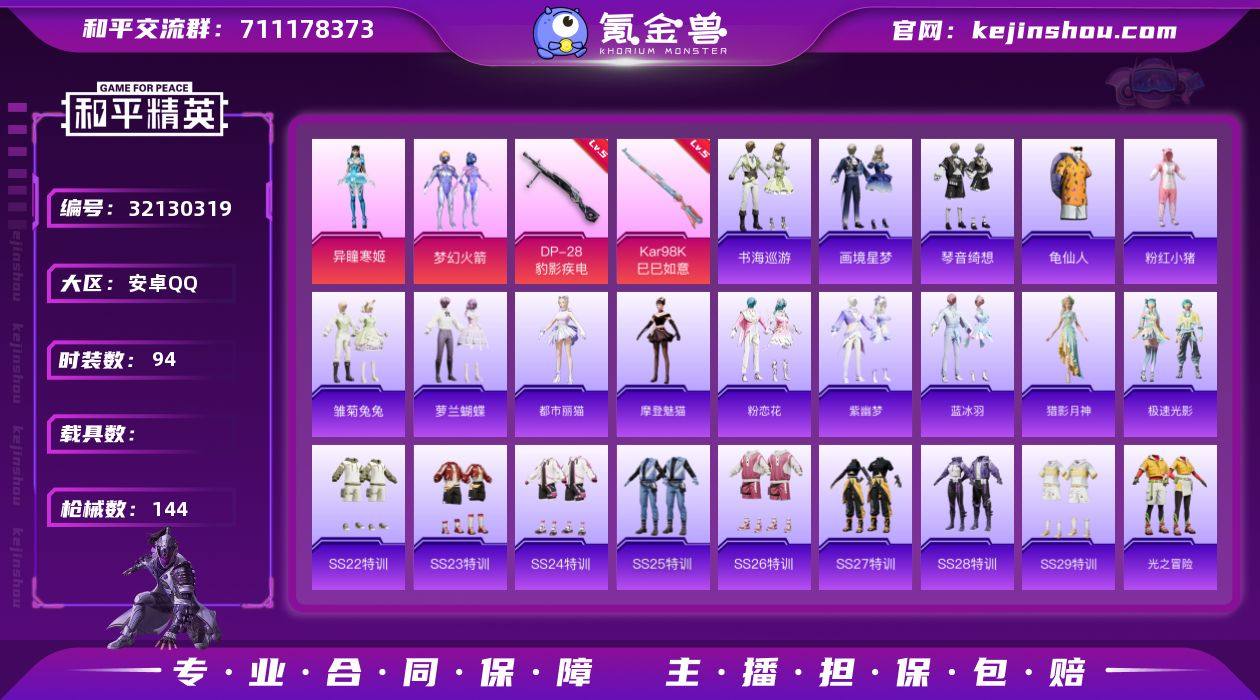 精品号2粉4特 梦幻火箭 安卓 手Q-2粉装-4特效枪-0载具-0粉色飞行器-37571热力值-2王牌印记-94套装-144枪皮 【热门品类】:粉装-梦幻火箭,套装-龟仙人,套装-粉红小猪 【粉色套装】:粉装-梦幻火箭,角色-异瞳寒姬 【粉色枪皮等级】:UMP45-萌骑冒险(五级),AKS-74U-森灵之息(五级),Kar98K-巳巳如意(五级),DP-28-豹影疾电(五级) 【粉色枪皮】:UMP45-萌骑冒险,AKS-74U-森灵之息,Kar98K-巳巳如意,DP-28-豹影疾电 【粉色降落伞】:梦幻火箭降落伞,橘柚倾心降落伞,千金淑猫降落伞,极意拳锋降落伞,炫彩糖果降落伞 【稀有套装】:套装-龟仙人,套装-雏菊兔兔,套装-萝兰蝴蝶,角色-都市丽猫,角色-摩登魅猫,套装-粉恋花,套装-紫幽梦,套装-蓝冰羽,角色-猎影月神,套装-极速光影,套装-书海巡游,套装-画境星梦,套装-琴音绮想,套装-雨过天青,套装-红釉青花 【稀有枪皮】:AKM-彩虹符号,AKM-破晓战魂,M16A4-幻世战舞者,SCAR-L-夜灯,SCAR-L-炫彩节奏,SCAR-L-红色方程式,M416-红色方程式,M416-蓝色火焰,GROZA-彩虹符号,GROZA-影袭,AUG-天降萌叽,AUG-耀粉歌者,M762-天降萌叽,M762-彩虹符号,M762-萌物绒绒,Mk47-虹云熊熊,AC-VAL-天降萌叽,AC-VAL-快闪甜心,蜜獾-天降萌叽,ACE32-画境星梦,UZI-啾咪啾咪,UZI-天降萌叽,UZI-影袭,UZI-红色方程式,UMP45-生命誓言,UMP45-蓝色火焰,汤姆逊-天降萌叽,汤姆逊-幻影战神,汤姆逊-耀粉歌者,汤姆逊-智耀战神,MP5K-画境星梦,P90-快闪甜心,P90-巳巳如意,Kar98K-彩虹符号,Kar98K-影袭,Kar98K-梦幻火箭,AWM-焰鹰斗篷,SKS-炫彩节奏,Mini14-梦幻火箭,Mini14-涂山之恋,Mini14-耀粉歌者,Mini14-绯穹魔姬,SLR-彩虹符号,MK20-H-快闪甜心,M1加兰德-画境星梦,S686-彩虹符号,S686-红色方程式,S686-千金淑猫,S12K-玩趣呆呆,S12K-破晓战魂...