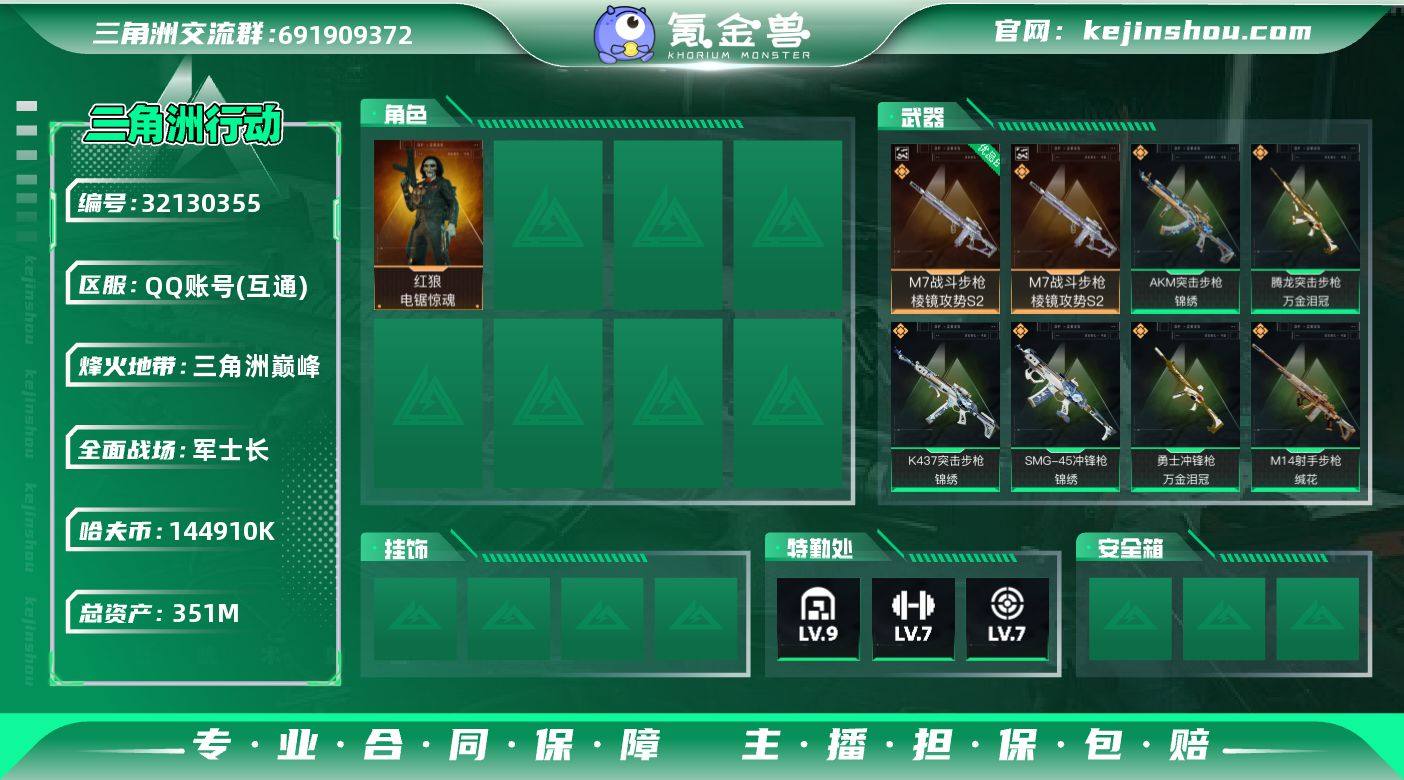 【PTSJZ3069】总资产(M):351M/哈夫币(K):144910K/哈夫币(K):144910K/传说枪皮数:20/全面战场等级:38_段位:军士长/烽火地带等级:60_段位:三角洲巅峰/红狼-电锯惊魂/近战-黑鹰/M7战斗步枪-棱镜攻势S2/优品B典藏武器外观-M7战斗步枪-棱镜攻势S2/M4A1突击步枪-阿米娅/AKM突击步枪-锦绣/M16A4突击步枪-狩猎时刻/AUG突击步枪-悠然茶歇/SCAR-H战斗步枪-启航/G3战斗步枪-狩猎时刻/CAR-15突击步枪-阿米娅/腾龙突击步枪-万金泪冠/K437突击步枪-锦绣/KC17突击步枪-电锯惊魂/MK47突击步枪-悠然茶歇/Vector冲锋枪-狩猎时刻/UZI冲锋枪-悠然茶歇/SMG-45冲锋枪-锦绣/勇士冲锋枪-能天使-午夜邮差/勇士冲锋枪-万金泪冠/M14射手步枪-缄花/SKS射手步枪-骑士/AWM狙击步枪-万金泪冠/QBZ95-1突击步枪-曙光/K416突击步枪-冬日风情/AUG突击步枪-蝮蛇/SG552突击步枪-哈夫克警备/SCAR-H战斗步枪-囚徒/MP5冲锋枪-深海恐惧/MP5冲锋枪-战术竞备/MP5冲锋枪-竞技风/P90冲锋枪-紧急戒备/SMG45冲锋枪-阿萨拉特攻/勇士冲锋枪-工业狂潮/MP7冲锋枪-六套之力/S12K霰弹枪-曙光/M250通用机枪-囚徒/QJB201轻机枪-炽焰/M14射手步枪-工业狂潮/M14射手步枪-航天庆典/SV-98狙击步枪-林中猎手/SV-98狙击步枪-囚徒/SV98狙击步枪-猎鳄行动/M700狙击步枪-蝮蛇/M700狙击步枪-哈夫克警备/M4A1突击步枪-零点/AKM突击步枪-肃杀/QBZ95-1突击步枪-公平竞技/K416突击步枪-碳纤维/K416突击步枪-精英联盟/K416突击步枪-一帆风顺/M7战斗步枪-捣蛋鬼/SG552突击步枪-2026/SG552突击步枪-贴花艺术/AK-12突击步枪-零点/SCAR-H战斗步枪-荣耀列队/SCAR-H战斗步枪-精英联盟/PTR-32突击步枪-天网/CAR-15突击步枪-亚特兰蒂斯/腾龙突击步枪-冰天雪地/MK47突击步枪-冰河潜伏者/MP5冲锋枪-弄臣/MP5冲锋枪-哈夫克卫队/P90冲锋枪-黄昏/P90冲锋枪-精英联盟/P90冲锋枪-捣蛋鬼/Vector冲...
