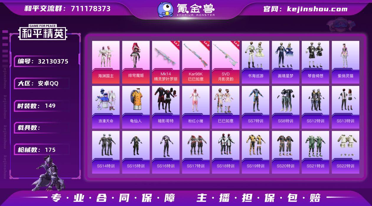 安卓 手Q-3粉装-6特效枪-0载具-0粉色飞行器-53407热力值-15王牌印记-149套装-175枪皮【热门品类】:套装-浪漫天命,套装-龟仙人,套装-暗影哥特,套装-粉红小猪【粉色套装】:粉装-海渊国主,角色-绯穹魔姬,角色-虎痴许褚【粉色枪皮等级】:UMP45-萌骑冒险(二级),AKS-74U-森灵之息(五级),Kar98K-巳巳如意(五级),Mk14-精灵梦叶罗丽(七级),Mk14-福马献瑞(五级),SVD-月影灵韵(四级)【粉色枪皮】:UMP45-萌骑冒险,AKS-74U-森灵之息,Kar98K-巳巳如意,Mk14-精灵梦叶罗丽,Mk14-福马献瑞,SVD-月影灵韵【粉色降落伞】:暗夜玫瑰降落伞,恐龙拽拽降落伞,暗夜鎏金降落伞,第五大道降落伞,仲夏莫吉托降落伞,圣堂之誓降落伞,罪夜之冕降落伞,虎痴许褚降落伞【稀有套装】:套装-龟仙人,套装-巳巳如意,套装-马上有钱,套装-暮夜私语,角色-紫俏灵猫,套装-书海巡游,套装-画境星梦,套装-琴音绮想,套装-雨过天青,套装-红釉青花,玩偶服-会说话的汤姆猫,角色-曹焱兵【稀有枪皮】:AKM-夜灯,AKM-彩虹符号,AKM-破晓战魂,AKM-萌趣颜团子,AKM-虎虎生威,AKM-霓虹街区,AKM-龙的传人,M16A4-夜灯,M16A4-幻世战舞者,M16A4-红色方程式,M16A4-蓝色火焰,M16A4-绒绒猫尾,SCAR-L-夜灯,SCAR-L-炫彩节奏,SCAR-L-玉兔迎春,SCAR-L-红色方程式,M416-夜灯,M416-糯团青竹,M416-红色方程式,M416-绯红前夜,M416-蓝色火焰,GROZA-异彩先驱,GROZA-彩虹符号,AUG-天降萌叽,AUG-甜蜜菠萝,AUG-耀粉歌者,AUG-青春冒险家,QBZ-彩虹符号,QBZ-神秘黑猫,M762-天降萌叽,M762-牛气冲天,M762-瑞龙福将,Mk47-洛神天依,AC-VAL-天降萌叽,蜜獾-天降萌叽,ACE32-画境星梦,UZI-天降萌叽,UZI-炫彩节奏,UZI-红色方程式,UMP45-夜灯,UMP45-春暖花开,UMP45-涂山之恋,UMP45-生命誓言,UMP45-蓝色火焰,Vector-夜灯,Vect...