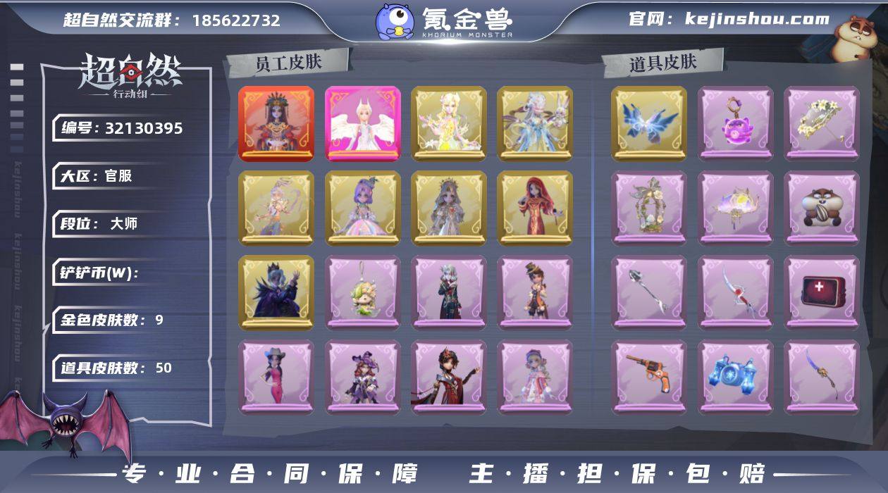 红色皮肤数量:1 金色皮肤数量:9 紫色皮肤数量:22 道具皮肤数量:50 镜生遗梦 春之声,瑶台梦,莲华渡,遗失的童话,圣光之谕,镜花辞,渡鸦公爵 卖家说:铲铲币还有1900多万