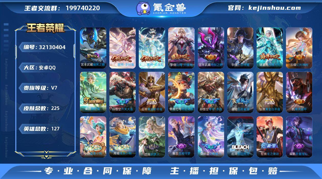 贵族等级:V7 典藏皮肤数:0 珍品无双皮肤数:0 无双皮肤数:0 珍品传说皮肤数:0 传说皮肤数:15 史诗皮肤数:66 皮肤数:225 英雄数:127 段位:星耀 卖家说:可二次账号,低价出售,带天幕带星元,低价出售,可以刀