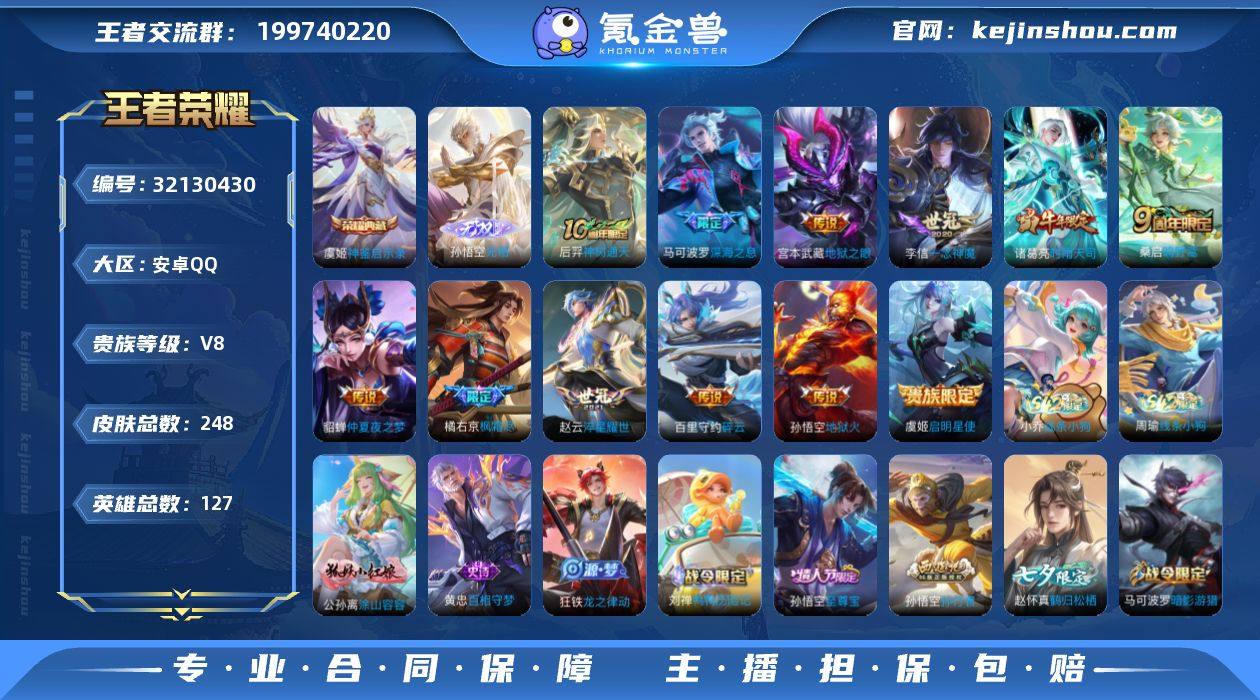 【秒换绑】安卓Q-V8-至尊星耀V段位-127英雄-248皮肤-1典藏皮肤-1无双-12传说-70史诗 【荣耀典藏】:虞姬神鉴启示录 【无双皮肤】:孙悟空无相 【传说皮肤】:后羿神树通天,桑启鸣野蒿,百里守约碎云,橘右京枫霜尽,马可波罗深海之息,赵云淬星耀世,诸葛亮时雨天司,虞姬启明星使,李信一念神魔,貂蝉仲夏夜之梦,宫本武藏地狱之眼,孙悟空地狱火 【限定皮肤】:姜子牙天穹之誓,狄仁杰阴阳师,赵云皇家上将,墨子神迹守卫,孙尚香蔷薇恋人,庄周高山流水,高渐离玩趣恶龙,钟无艳超时空战士,白起夜都怪侠,芈月白晶晶,元歌云间偶戏,元歌无心,夏侯惇朔风刀,夏侯惇匿光决锋者,甄姬游园惊梦,甄姬落雪兰心,马可波罗暗影游猎,马可波罗深海之息,狄仁杰魔术师,狄仁杰万华元夜,达摩沙漠行僧,项羽海滩派对,老夫子醍醐杖,老夫子航海奇遇记,程咬金演武夺筹,韩信飞衡,王昭君午后时光,兰陵王金庭之子,橘右京枫霜尽,亚瑟潮玩骑士王,孙悟空至尊宝,孙悟空孙行者,后羿圣弓游侠,李元芳云中旅人,虞姬启明星使,钟馗驱傩正仪,干将莫邪胡桃夹子,干将莫邪真爱魔法,雅典娜黎明之约,鬼谷子原初探秘者,鬼谷子五谷丰年,诸葛亮时雨天司,苏烈千军破阵,百里守约朱雀志,弈星混沌棋,沈梦溪大漠名商,明世隐疑决卦,明世隐吟游魔法,裴擒虎李小龙,裴擒虎擒涛扼浪,狂铁电玩高手,米莱狄御霄,云中君纤云弄巧,伽罗天狼溯光者,猪八戒西部大镖客,上官婉儿梁祝,上官婉儿天狼绘梦者,嫦娥拒霜思,鲁班大师探海日志,镜匿光追影者,桑启海盐诗旅,艾琳女武神,赵怀真鹤归松栖,张良古海寻踪,鬼谷子天穹祈灯,沈梦溪龙舞盛年 【年限皮肤】:百里守约朱雀志,韩信飞衡,诸葛亮时雨天司 【赛季限定】:米莱狄御霄,夏侯惇朔风刀,弈星混沌棋,明世隐疑决卦,老夫子醍醐杖,鬼谷子原初探秘者,狄仁杰万华元夜,...