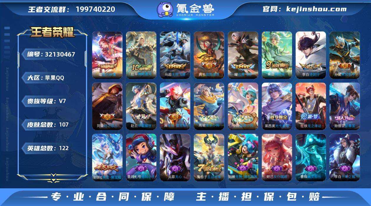 苹果Q-V7-最强王者段位-122英雄-107皮肤-1典藏皮肤-10传说-35史诗【荣耀典藏】:瑶拾光映像【传说皮肤】:后羿神树通天,桑启鸣野蒿,典韦战鼓燎原,澜电玩雷克斯,李白诗剑行,马超无双飞将,孙策末日机甲,赵云淬星耀世,曜云鹰飞将,刘备时之恋人【限定皮肤】:狄仁杰阴阳师,赵云皇家上将,妲己热情桑巴,鲁班七号狮舞东方,高渐离玩趣恶龙,元歌无心,夏侯惇朔风刀,狄仁杰魔术师,狄仁杰万华元夜,达摩沙漠行僧,项羽海滩派对,老夫子醍醐杖,程咬金演武夺筹,兰陵王金庭之子,孙悟空至尊宝,李元芳云中旅人,钟馗神迹守卫,钟馗驱傩正仪,雅典娜黎明之约,鬼谷子原初探秘者,鬼谷子五谷丰年,苏烈千军破阵,弈星混沌棋,沈梦溪大漠名商,明世隐疑决卦,米莱狄御霄,云中君纤云弄巧,盾山御銮,鲁班大师探海日志,桑启海盐诗旅,安琪拉乘龙聚宝船,沈梦溪龙舞盛年【年限皮肤】:安琪拉乘龙聚宝船【赛季限定】:米莱狄御霄,盾山御銮,夏侯惇朔风刀,弈星混沌棋,明世隐疑决卦,老夫子醍醐杖,鬼谷子原初探秘者,狄仁杰万华元夜,程咬金演武夺筹,钟馗驱傩正仪,苏烈千军破阵,达摩沙漠行僧,兰陵王金庭之子,沈梦溪大漠名商,李元芳云中旅人,桑启海盐诗旅,鲁班大师探海日志,东皇太一噬灭天穹,亚瑟荣光之誓,雅典娜黎明之约【战令限定】:鲁班七号狮舞东方,钟馗神迹守卫,莱西奥光弋星穹,明世隐往忆晖光,周瑜线条小狗,小乔线条小狗【史诗皮肤】:周瑜线条小狗,小乔线条小狗,百里玄策罗小黑战记,莱西奥光弋星穹,狂铁龙之律动,马可波罗星界特工,安琪拉乘龙聚宝船,刘禅电玩爆裂旋风,元歌无心,鬼谷子五谷丰年,雅典娜黎明之约,云中君纤云弄巧,狄仁杰鹰眼统帅,鲁班七号狮舞东方,阿轲节奏热浪,刘禅天才门将,百里守约特工魅影,安琪拉心灵骇客,雅典娜冰冠公主,亚瑟心灵战警,诸葛亮黄金分...