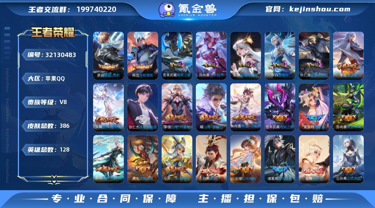 苹果Q-V8-最强王者段位-128英雄-386皮肤-2典藏皮肤-30传说-104史诗【英雄全皮】:典韦全皮,孙权全皮,敖隐全皮,夏洛特全皮,戈娅全皮,海诺全皮【荣耀典藏】:李白鸣剑曳影,韩信弑枪猎影【传说皮肤】:女娲愿照千秋盛,云缨幻光神枪,桑启鸣野蒿,吕布曦玄引,貂蝉曦玄引,典韦战鼓燎原,孙尚香乘龙问璇玑,赵云乘龙铭钟鼎,狄仁杰夜礼服假面,诸葛亮鹤羽星尊,公孙离记忆之芯,夏洛特浮生妄,花木兰燃星之曲,伽罗炽翼辉光,孙悟空齐天大圣,小乔山海琳琅生,曜山海苍雷引,李信山海炽霜斩,吕布怒海麟威,百里守约碎云,铠绛天战甲,虞姬启明星使,张良黄金白羊座,干将莫邪久胜战神,后羿黄金射手座,貂蝉仲夏夜之梦,李白凤求凰,孙尚香末日机甲,宫本武藏地狱之眼,狄仁杰超时空战士【限定皮肤】:白起狰,蔡文姬夏日便利店,大乔绒语心约,虞姬夏日便利店,姜子牙天穹之誓,杨戬破阵退雄兵,狄仁杰阴阳师,小乔山海琳琅生,赵云皇家上将,赵云龙胆,嬴政优雅恋人,嬴政白昼王子,孙尚香蔷薇恋人,庄周高山流水,钟无艳超时空战士,扁鹊奇幻香踪,芈月重明,吕布猎兽之王,元歌无心,夏侯惇朔风刀,甄姬游园惊梦,甄姬落雪兰心,曹操烛龙,典韦穷奇,典韦蓝屏警告,典韦岱宗,马可波罗山海玄木吟,狄仁杰魔术师,狄仁杰万华元夜,项羽海滩派对,老夫子醍醐杖,程咬金演武夺筹,花木兰燃星之曲,孙悟空孙行者,孙悟空齐天大圣,牛魔御旌,李元芳匿光侦查者,李元芳云中旅人,虞姬启明星使,钟馗驱傩正仪,杨玉环遇见飞天,杨戬潮玩骑兵,女娲朔望之晖,雅典娜黎明之约,蔡文姬繁星吟游,太乙真人饕餮,太乙真人华丽摇滚,鬼谷子原初探秘者,鬼谷子五谷丰年,诸葛亮鹤羽星尊,黄忠烈魂,百里玄策原初追逐者,弈星混沌棋,梦奇顽趣,沈梦溪大漠名商,沈梦溪匿光破解者,明世隐疑决卦,裴擒虎李小龙,裴擒虎擒...