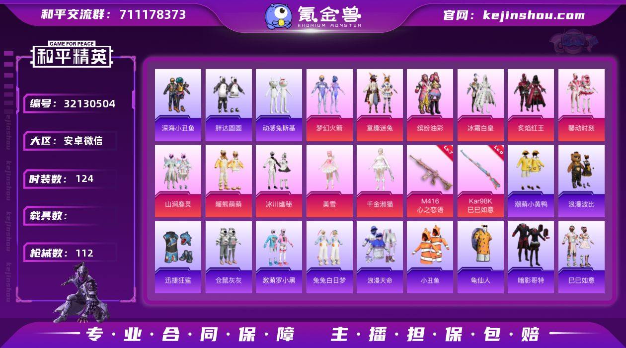 安卓 微信-11粉装-2特效枪-0载具-1粉色飞行器-44959热力值-10王牌印记-124套装-112枪皮【热门品类】:粉装-梦幻火箭,粉装-童趣迷兔,粉装-缤纷油彩,套装-浪漫天命,套装-深海小丑鱼,套装-小丑鱼,套装-胖达圆圆,套装-动感兔斯基人偶服,套装-龟仙人,套装-潮萌小黄鸭,套装-暗影哥特,套装-浪漫波比【粉色套装】:粉装-梦幻火箭,粉装-缤纷油彩,粉装-冰霜白皇,粉装-童趣迷兔,粉装-炙焰红王,粉装-馨动时刻,粉装-山涧鹿灵,粉装-暖熊萌萌,粉装-冰川幽秘,角色-美雪,角色-千金淑猫【粉色枪皮等级】:M416-心之恋语(七级),Kar98K-巳巳如意(四级)【粉色枪皮】:M416-心之恋语,Kar98K-巳巳如意【粉色飞行器】:天之羽翼飞行器【粉色降落伞】:梦幻火箭降落伞,荧光虫舞降落伞,童趣迷兔降落伞,焦糖拿铁降落伞,碧影闪光降落伞,炙焰牛王降落伞,暖熊萌萌降落伞,第五大道降落伞,千金淑猫降落伞,樱桃泡泡降落伞【稀有套装】:套装-龟仙人,套装-巳巳如意,角色-都市丽猫,角色-摩登魅猫,套装-燕燕于飞,套装-鱼渊荷华,角色-糖霜甜心【稀有枪皮】:AKM-彩虹符号,AKM-恐龙拽拽,AKM-灼热熔岩,AKM-虎虎生威,AKM-霓虹街区,AKM-龙的传人,M16A4-幻世战舞者,M16A4-甜心亚梦,M16A4-千金淑猫,SCAR-L-玉兔迎春,SCAR-L-黄金龙骨,GROZA-异彩先驱,AUG-耀粉歌者,QBZ-彩虹符号,QBZ-飞驰魅影,M762-奇异狩猎者,M762-暖熊萌萌,M762-瑞龙福将,AC-VAL-天降萌叽,AC-VAL-快闪甜心,AC-VAL-甜心亚梦,蜜獾-垂柳戏鸭,蜜獾-天降萌叽,UZI-啾咪啾咪,UZI-天降萌叽,UMP45-绒宝小鹅,Vector-焰鹰斗篷,Vector-生命誓言,汤姆逊-天降萌叽,汤姆逊-异彩先驱,MP5K-异彩先驱,P90-快闪甜心,P90-飞驰魅影,P90-巳巳如意,Kar98K-梦幻火箭,Kar98K-洛神天依,Kar98K-炫彩节奏,Kar98K-蓝莓炮弹,Kar98K-飞驰魅影,M...