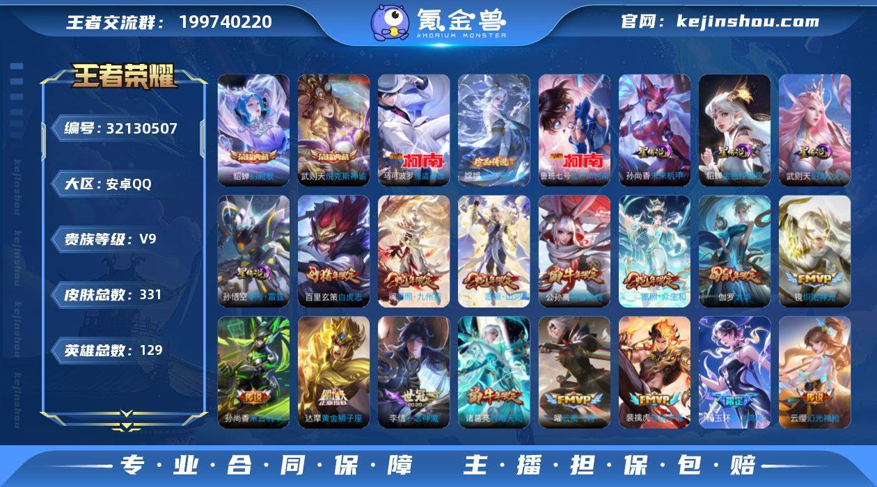安卓Q-V9-至尊星耀II段位-129英雄-331皮肤-2典藏皮肤-1典藏英雄-3珍品传说-29传说-89史诗【英雄全皮】:影全皮【荣耀典藏】:武则天英雄,武则天倪克斯神谕,貂蝉幻阙歌【珍品传说】:嫦娥器灵落星盏,鲁班七号江户川柯南,马可波罗怪盗基德【传说皮肤】:杨玉环星之鸣奏,司空震愿照山河定,妲己愿照众生和,澜愿照九州拓,云缨幻光神枪,裴擒虎祥瑞亨通,王昭君映山客,公孙离祈雪灵祝,诸葛亮时雨天司,铠绛天战甲,镜炽阳神光,虞姬启明星使,孙悟空零号赤焰,曜云鹰飞将,李信一念神魔,刘备时之恋人,伽罗太华,貂蝉猫影幻舞,张良黄金白羊座,干将莫邪久胜战神,虞姬云霓雀翎,达摩黄金狮子座,百里玄策白虎志,花木兰冠军飞将,后羿黄金射手座,貂蝉仲夏夜之梦,孙尚香末日机甲,武则天海洋之心,狄仁杰超时空战士【限定皮肤】:白起狰,狄仁杰阴阳师,赵云皇家上将,墨子神迹守卫,孙尚香蔷薇恋人,鲁班七号狮舞东方,庄周高山流水,钟无艳超时空战士,孙膑天狼运算者,白起夜都怪侠,芈月白晶晶,芈月幻夜卜梦,吕布猎兽之王,吕布御风骁将,周瑜赤莲之焰,元歌云间偶戏,甄姬落雪兰心,马可波罗暗影游猎,狄仁杰魔术师,狄仁杰万华元夜,达摩星际陆战队,达摩沙漠行僧,项羽海滩派对,项羽霸王别姬,老夫子醍醐杖,老夫子航海奇遇记,程咬金演武夺筹,王昭君午后时光,兰陵王驯魔猎人,兰陵王金庭之子,亚瑟潮玩骑士王,孙悟空大圣娶亲,孙悟空零号赤焰,牛魔御旌,牛魔奔雷神使,后羿圣弓游侠,李元芳银河之约,李元芳云中旅人,虞姬霸王别姬,虞姬启明星使,钟馗神迹守卫,钟馗驱傩正仪,杨玉环遇见飞天,干将莫邪真爱魔法,雅典娜单词大作战,蔡文姬繁星吟游,东皇太一逐梦之光,鬼谷子原初探秘者,鬼谷子五谷丰年,诸葛亮时雨天司,黄忠火炮绅士,苏烈千军破阵,百里玄策白虎志,百里玄策原初追逐...