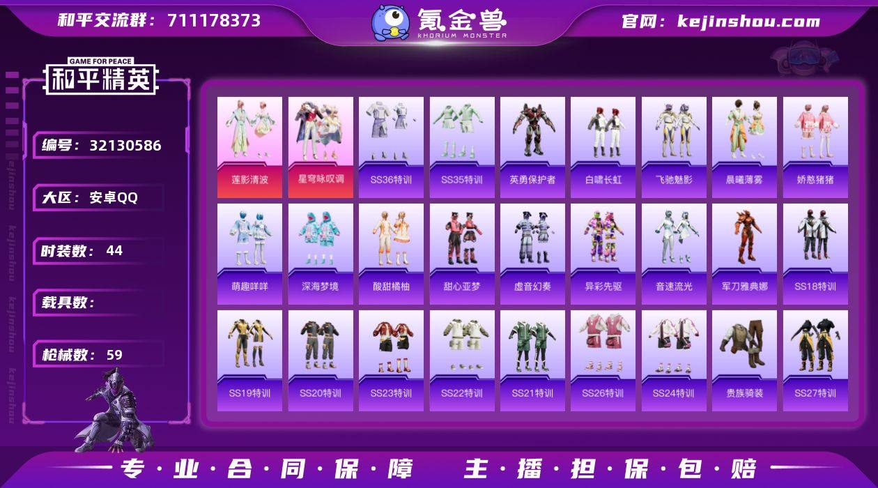 【ky8】安卓 手Q-1粉装-5特效枪-0载具-0粉色飞行器-33867热力值-2王牌印记-108套装-134枪皮 【热门品类】:套装-龟仙人 【粉色套装】:套装-创世·救赎 【粉色枪皮等级】:M416-电玩时刻(五级),GROZA-镜光银凌(五级),UMP45-量子极限(五级),Kar98K-巳巳如意(五级),PKM-江南烟雨(五级) 【粉色枪皮】:M416-电玩时刻,GROZA-镜光银凌,UMP45-量子极限,Kar98K-巳巳如意,PKM-江南烟雨 【粉色降落伞】:垂柳戏鸭降落伞,江南烟雨降落伞,炫彩糖果降落伞 【稀有套装】:套装-龟仙人,套装-巳巳如意,套装-雏菊兔兔,套装-萝兰蝴蝶,角色-狂花道·娜可露露,套装-糖糖葫芦,套装-青团波波,角色-俏兔智灵,套装-燕燕于飞,套装-鱼渊荷华,套装-樱梦幻音 【稀有枪皮】:AKM-彩虹符号,AKM-江南烟雨,AKM-龙的传人,M16A4-幻世战舞者,M16A4-蓝色火焰,SCAR-L-夜灯,SCAR-L-玉兔迎春,M416-蓝色火焰,GROZA-彩虹符号,GROZA-影袭,AUG-天降萌叽,AUG-甜蜜菠萝,AUG-耀粉歌者,QBZ-彩虹符号,M762-彩虹符号,AC-VAL-天降萌叽,蜜獾-天降萌叽,蜜獾-娇憨猪猪,UZI-天降萌叽,UZI-娇憨猪猪,UMP45-夜灯,UMP45-生命誓言,UMP45-蓝色火焰,Vector-焰鹰斗篷,汤姆逊-天降萌叽,汤姆逊-耀粉歌者,AKS-74U-鬼刀,P90-金蛇镇世,P90-巳巳如意,Kar98K-彩虹符号,M24-炫彩节奏,AWM-焰鹰斗篷,SKS-炫彩节奏,VSS-彩虹符号,Mini14-梦幻火箭,Mini14-炫彩节奏,Mini14-耀粉歌者,Mini14-镭金极速,SLR-娇憨猪猪,AMR-鬼刀,S686-彩虹符号,S686-生命誓言,S686-红色方程式,S686-巳巳如意,S1897-炫彩节奏,S12K-玩趣呆呆,S12K-夜灯,S12K-娇憨猪猪,DBS-焰鹰斗篷,M249-彩虹符号,M249-破晓战魂,DP-28-焰鹰斗篷,TMP-9-江南烟雨,战术弩-江南烟雨,大砍刀-黑金刀,大砍刀-鬼刀,破片手榴弹-巳巳如意 【其他套装】:套装-SS21特...
