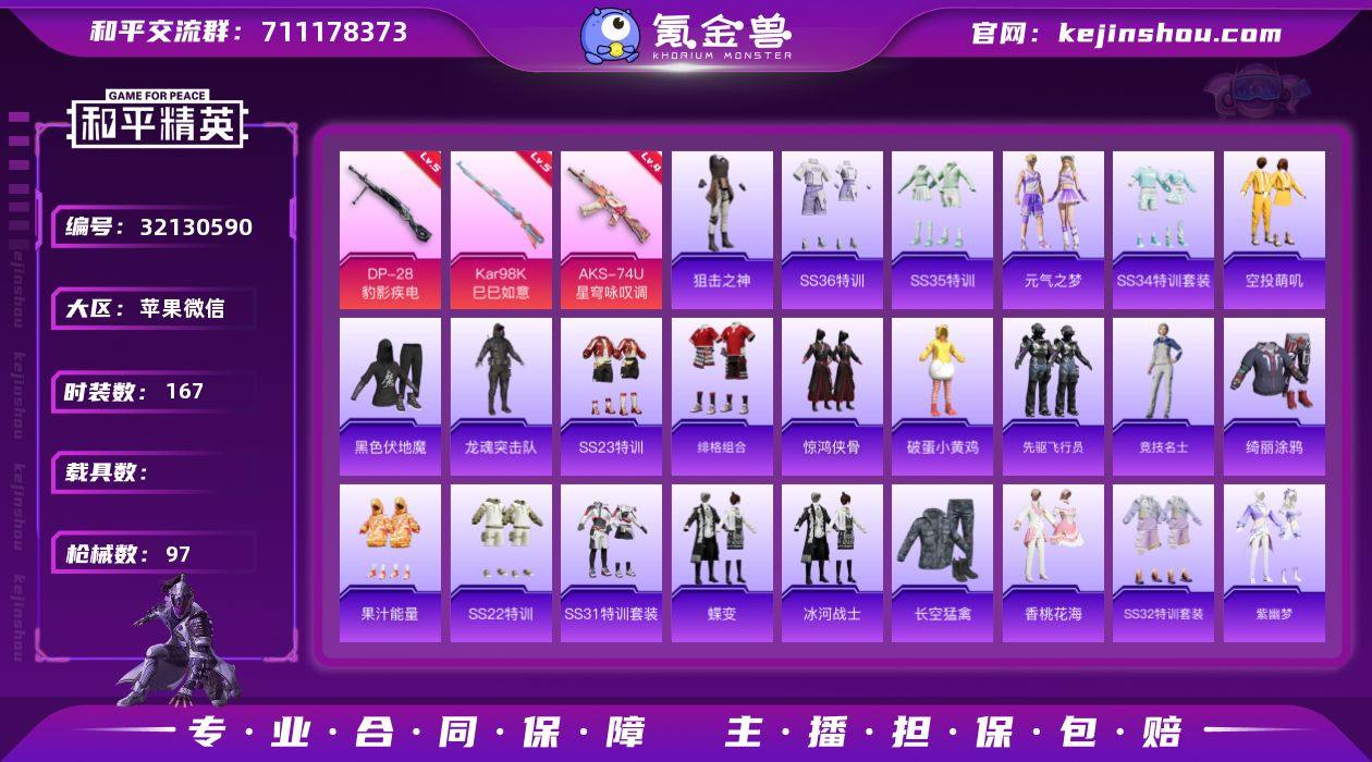 实名:可二次实名 是否支持人脸包赔:支持 特效枪数量:3 时装数:167 枪械数:97 五级DP-28-豹影疾电,五级Kar98K-巳巳如意,四级AKS-74U-星穹咏叹调 狙击之神,SS36特训,SS35特训,元气之梦,SS34特训套装,2B战斗服款,缤纷果语,冰河战士,雏菊兔兔,长空猛禽,蝶变,绯格组合,湖蓝色名流,黑色伏地魔,幻世战舞者,惊鸿侠骨,竞技名士,锦衣飞扬,空投萌叽,蓝冰羽,龙的传人,龙魂突击队,萝兰蝴蝶,果汁能量,柠萌假日,破蛋小黄鸡,绮丽涂鸦,青团波波,SS17特训,SS18特训,SS20特训,SS22特训,SS23特训,SS25特训,SS26特训,SS30特训套装,SS31特训套装,SS32特训套装,SS33特训套装,糖糖葫芦,特训学院,先驱飞行员,香桃花海,紫幽梦 炫彩糖果飞行器,英伦信使飞行器,炫彩糖果降落伞,百万伏特降落伞,超新星降落伞,童趣迷兔降落伞,未来领航者降落伞,英伦信使降落伞