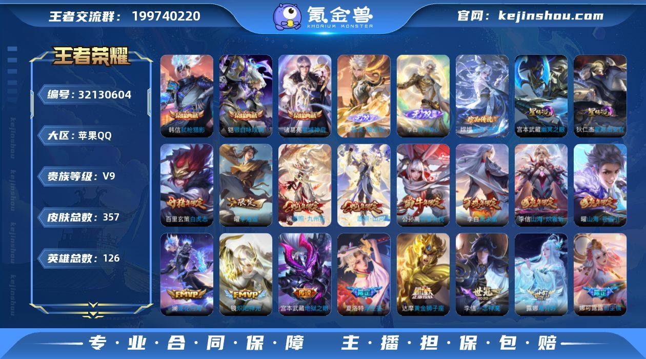 苹果Q-V4-永恒钻石III段位-126英雄-357皮肤-3典藏皮肤-2无双-1珍品传说-39传说-86史诗【英雄全皮】:娜可露露全皮,曜全皮,空空儿全皮【荣耀典藏】:诸葛亮星域神启,铠银白咏叹调,韩信弑枪猎影【无双皮肤】:曜器灵螭龙剑,李白碎月剑心【珍品传说】:嫦娥器灵落星盏【传说皮肤】:司空震愿照山河定,澜愿照九州拓,桑启鸣野蒿,澜逐花归海,露娜霜月吟,张飞百相守梦,夏洛特浮生妄,孙悟空齐天大圣,小乔山海琳琅生,曜山海苍雷引,李信山海炽霜斩,吕布怒海麟威,李白诗剑行,狄仁杰神器狴犴令,橘右京枫霜尽,娜可露露前尘镜,孙策末日机甲,孙尚香异界灵契,貂蝉遇见胡旋,赵云淬星耀世,曜李逍遥 ,李元芳飞鸢探春,公孙离祈雪灵祝,镜炽阳神光,虞姬启明星使,孙悟空零号赤焰,关羽武圣,曜云鹰飞将,李信一念神魔,刘备时之恋人,貂蝉猫影幻舞,干将莫邪久胜战神,达摩黄金狮子座,百里玄策白虎志,梦奇胖达荣荣,貂蝉仲夏夜之梦,李白凤求凰,宫本武藏地狱之眼,狄仁杰超时空战士【限定皮肤】:蔡文姬夏日便利店,虞姬夏日便利店,姜子牙天穹之誓,狄仁杰阴阳师,小乔山海琳琅生,赵云皇家上将,墨子神迹守卫,墨子降魔,孙尚香异界灵契,庄周高山流水,钟无艳超时空战士,吕布猎兽之王,吕布御风骁将,元歌无心,甄姬落雪兰心,典韦穷奇,马可波罗暗影游猎,马可波罗山海玄木吟,狄仁杰魔术师,狄仁杰万华元夜,狄仁杰神器狴犴令,达摩星际陆战队,达摩沙漠行僧,项羽海滩派对,老夫子醍醐杖,老夫子航海奇遇记,关羽武圣,貂蝉遇见胡旋,程咬金演武夺筹,韩信飞衡,韩信傲雪梅枪,王昭君凤凰于飞,王昭君午后时光,兰陵王金庭之子,花木兰瑞麟志,花木兰默契交锋,娜可露露前尘镜,橘右京枫霜尽,亚瑟潮玩骑士王,孙悟空大圣娶亲,孙悟空零号赤焰,孙悟空齐天大圣,牛魔御旌,后羿辉光之辰,后羿圣...