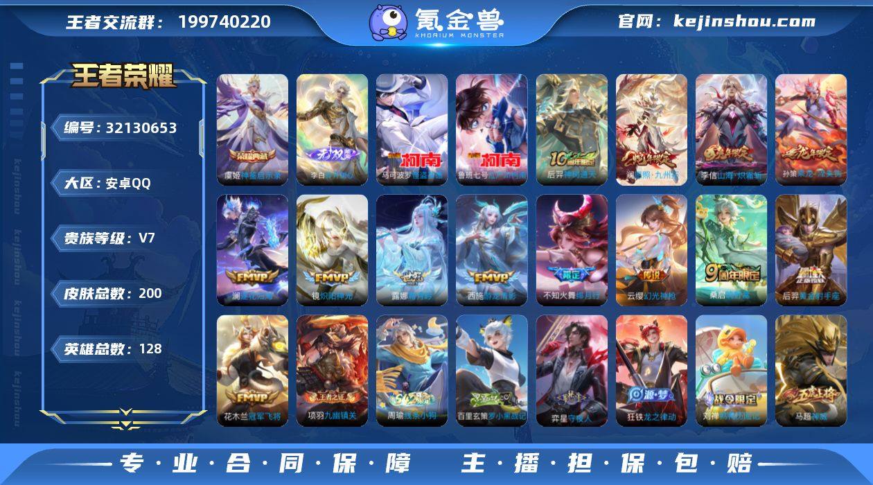 安卓Q-V7-永恒钻石I段位-128英雄-200皮肤-1典藏皮肤-1无双-2珍品传说-13传说-55史诗 【英雄全皮】:影全皮 【荣耀典藏】:虞姬神鉴启示录 【无双皮肤】:李白碎月剑心 【珍品传说】:马可波罗怪盗基德,鲁班七号江户川柯南 【传说皮肤】:后羿神树通天,澜愿照九州拓,云缨幻光神枪,桑启鸣野蒿,孙策乘龙淬吴钩,澜逐花归海,露娜霜月吟,李信山海炽霜斩,不知火舞绯月行,西施游龙清影,镜炽阳神光,花木兰冠军飞将,后羿黄金射手座 【限定皮肤】:狄仁杰阴阳师,赵云皇家上将,钟无艳超时空战士,甄姬落雪兰心,狄仁杰魔术师,项羽海滩派对,不知火舞绯月行,孙悟空孙行者,后羿辉光之辰,李元芳匿光侦查者,李元芳云中旅人,鬼谷子五谷丰年,梦奇顽趣,裴擒虎擒涛扼浪,云中君纤云弄巧,李信山海炽霜斩,上官婉儿梁祝,嫦娥暖冬兔眠,鲁班大师探海日志,桑启海盐诗旅,暃星界游侠,阿古朵江河有灵,张良古海寻踪,蒙犽百解令,鬼谷子天穹祈灯,李白碎月剑心,姬小满妄想食味,孙策乘龙淬吴钩,百里玄策超元猎域,沈梦溪龙舞盛年,刘邦剑破天穹,周瑜熔金海岸 【年限皮肤】:后羿辉光之辰,李信山海炽霜斩,孙策乘龙淬吴钩,澜愿照九州拓 【赛季限定】:李元芳云中旅人,桑启海盐诗旅,裴擒虎擒涛扼浪,鲁班大师探海日志,张良古海寻踪,鬼谷子天穹祈灯,刘邦剑破天穹,东皇太一噬灭天穹,太乙真人谧流熔炉,钟馗虚灵犬护,甄姬逆浪荇歌,亚瑟荣光之誓,梦奇顽趣,牛魔星界战将,项羽九幽镇关 【战令限定】:钟无艳超时空战士,甄姬落雪兰心,暃星界游侠,嫦娥暖冬兔眠,百里守约百相守梦,老夫子百相守梦,刘禅鸭鸭历险记,沈梦溪鸭鸭历险记,周瑜线条小狗 【史诗皮肤】:鲁班七号电玩小子,露娜紫霞仙子,赵云皇家上将,赵云未来纪元,甄姬冰雪圆舞曲,王昭君偶像歌手,狄仁杰魔术师,宫本武藏鬼剑武藏,孙尚...