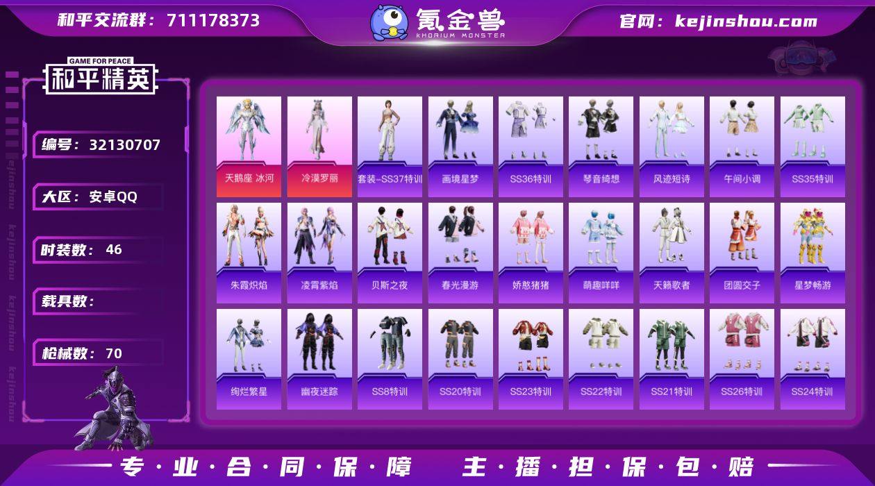 【和平精英】2粉装,5特效枪,0载具,历史最高段位:卓越王牌10星 王牌印记7次 热力值:39890,88套装,142枪械,155装备,69战备;套装:角色-天鹅座 冰河,角色-冷漠罗丽,套装-白色伏地魔,套装-竞技名士,套装-酒红色名流,套装-长空猛禽,套装-竞技勇士朋克,套装-海岛探路者,套装-完美偶像,套装-酷萌兔限定,套装-都市漫游者,套装-破晓战魂,套装-潮流炫酷,套装-酷潮明星,套装-缤纷果语,套装-滨海厨神,套装-极速红龙,套装-麻辣教官,套装-破蛋小黄鸡,套装-疯狂小兔子,套装-北国孤狼,套装-霓虹街区,套装-SS8特训,套装-夏日音浪,套装-牛气满满,套装-狙击之神,套装-牛气冲天,套装-热情海星,套装-纯真浪花,套装-天籁歌者,套装-星梦畅游,套装-团圆交子,套装-SS20特训,套装-SS21特训,套装-萌趣咩咩,套装-娇憨猪猪,套装-玉兔迎春,套装-SS22特训,套装-绚烂繁星,套装-光之冒险,套装-绯格组合,套装-SS23特训,套装-SS24特训,套装-SS25特训,套装-龙的传人,套装-SS26特训,套装-快闪甜心,套装-春光漫游,套装-空岛之星,套装-贝斯之夜,套装-焰鹰斗篷,套装-幽夜迷踪,套装-幻羽潜行,套装-SS27特训,套装-恋语绒绒,套装-老实芭蕉,套装-SS28特训,角色-Mark.06,套装-海盐绵绵冰,套装-SS29特训,套装-异域银装,套装-SS30特训,角色-夜瞳黯灵,角色-六号稻草人,套装-SS31特训,套装-紫幽梦,套装-粉恋花,套装-SS33特训,套装-云朵鹅,套装-SS32特训,套装-蓝冰羽,套装-顶瓜瓜,套装-雪绒豹,套装-大橘大利,套装-元气之梦,套装-SS34特训,套装-朱霞炽焰,套装-凌霄紫焰,套装-薄荷星砂,套装-SS35特训,套装-午间小调,套装-风迹短诗,套装-琴音绮想,套装-画境星梦,套装-SS37特训,套装-SS36特训,套装-雪国风尚,套装-萌鸡速递;枪皮:蜜獾-娇憨猪猪,蜜獾-垂柳戏鸭,蜜獾-...