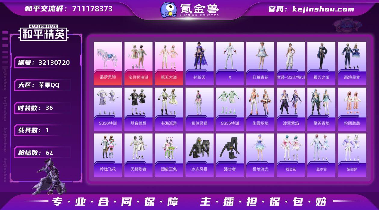 【和平精英】3粉装,7特效枪,1载具,历史最高段位:超级王牌11星 王牌印记3次 热力值:33561,66套装,119枪械,159装备,92战备;套装:套装-宝贝奶油派,套装-第五大道,人物-小舞·恋语,套装-竞技名士,套装-长空猛禽,套装-漫步者,套装-海岛探路者,套装-鹰眼刺客,套装-冰冻风暴,套装-完美偶像,套装-街头潮人,套装-蓝彩潮人,套装-魅力单车,套装-潮流炫酷,套装-破蛋小黄鸡,套装-玲珑飞花,套装-顽皮玉兔,套装-战术大师,套装-狙击之神,套装-天籁歌者,套装-粉团憨憨,套装-漫游都市,套装-恋语绒绒,角色-极地流光,角色-紫俏灵猫,套装-异域银装,套装-小鸟芋圆,套装-紫幽梦,套装-粉恋花,套装-晶辉守护,套装-SS33特训,套装-云朵鹅,套装-巳巳如意,套装-SS32特训,套装-彩虹兔,套装-青翼流星,套装-蓝冰羽,套装-雪绒豹,套装-狂鲨锋刃,套装-霓虹热舞,玩偶服-喜羊羊,套装-元气之梦,套装-SS34特训,套装-擎苍青焰,套装-朱霞炽焰,套装-游乐,套装-凌霄紫焰,套装-薄荷星砂,套装-SS35特训,套装-琴音绮想,套装-粉黛兰香,套装-画境星梦,套装-书海巡游,套装-阳光菠萝,套装-SS37特训,套装-SS36特训,角色-霜刃之御,套装-红釉青花,套装-雪国风尚,套装-雨过天青,套装-萌鸡速递,角色-孙斩天,套装-福马献瑞,套装-马上有钱,套装-玲珑侠影,角色-X;枪皮:GROZA-影袭,GROZA-拉面少女,GROZA-紫矿核心,GROZA-福马献瑞,3级AUG-星梦奇缘,AUG-甜蜜菠萝,AUG-耀粉歌者,AUG-异域银装,AUG-紫晶流影,AKM-涂鸦街区,AKM-星之彼岸,AKM-霓彩脉冲,G36C-星穹咏叹调,G36C-灵驹仙姬,Famas-霓彩脉冲,Famas-乌木金纹,M762-彩虹甜喵,M762-云朵鹅,SCAR-L-炫彩节奏,SCAR-L-彩虹符号,蜜獾-绯穹魔姬,蜜獾-启元战纹,蜜獾-乌木金纹,ACE32-画境星梦,ACE32-冰晶雪宝,ARX-凌霄紫焰,M16A4...