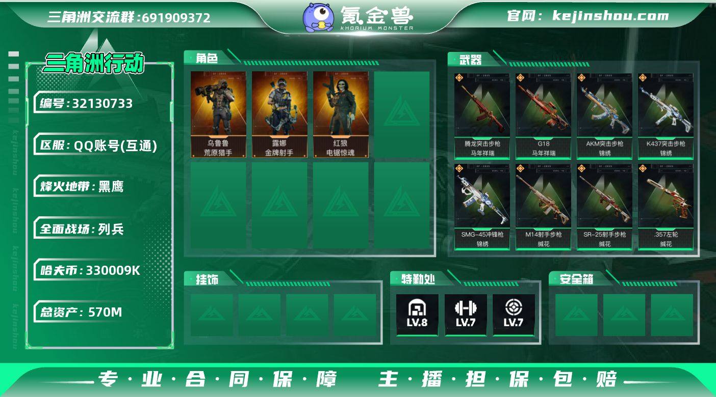 【SJZD2733】总资产(M):570M/哈夫币(K):330009K/哈夫币(K):330009K/传说枪皮数:13/全面战场等级:8_段位:列兵/烽火地带等级:60_段位:黑鹰/红狼-电锯惊魂/露娜-金牌射手(S7)/乌鲁鲁-荒原猎手/近战-黑鹰/AKM突击步枪-锦绣/SG552突击步枪-运动员/SCAR-H战斗步枪-启航/腾龙突击步枪-马年祥瑞/K437突击步枪-锦绣/KC17突击步枪-电锯惊魂/SMG-45冲锋枪-锦绣/M14射手步枪-蛮荒/M14射手步枪-缄花/SKS射手步枪-骑士/SR-25射手步枪-缄花/.357左轮-缄花/G18-马年祥瑞/PTR-32突击步枪-碎冰行动(典藏)/QBZ95-1突击步枪-曙光/K416突击步枪-冬日风情/K416突击步枪-腊梅/K416突击步枪-阿萨拉特攻/AUG突击步枪-蝮蛇/M7战斗步枪-百步穿杨/G3战斗步枪-流沙送葬/G3战斗步枪-哈夫克警备/AS Val突击步枪-百步穿杨/K437突击步枪-丛林谍踪/MP5冲锋枪-竞技风/Vector冲锋枪-百步穿杨/Vector冲锋枪-异域战争/SMG45冲锋枪-阿萨拉特攻/SR-3M紧凑突击步枪-开工大吉/勇士冲锋枪-深海恐惧/勇士冲锋枪-丛林谍踪/MP7冲锋枪-六套之力/M249轻机枪-丛林谍踪/M250通用机枪-囚徒/QJB201轻机枪-炽焰/VSS射手步枪-丛林谍踪/SVD狙击步枪-阿萨拉工艺/M14射手步枪-工业狂潮/M14射手步枪-航天庆典/M700狙击步枪-百步穿杨/AWM狙击步枪-流沙送葬/UZI冲锋枪-旧梦/M14射手步枪-巨兽/M4A1突击步枪-繁盛/AKM突击步枪-肃杀/ASh-12战斗步枪-繁盛/K416突击步枪-一帆风顺/M7战斗步枪-捣蛋鬼/SG552突击步枪-2026/SG552突击步枪-马年新春/SG552突击步枪-贴花艺术/ AK-12突击步枪-马年新春/SCAR-H战斗步枪-荣耀列队/G3战斗步枪-主宰/CAR-15突击步枪-前沿科技/CAR-15突击步枪-精英联盟/CAR-15突击步枪-来财/腾龙突击步枪-冰天雪地/KC17突击步枪-来财/MK47突击步枪-冰河潜伏者/MP5冲锋枪-弄臣/MP5冲锋枪-哈夫克卫队/UZI冲锋枪-前沿科技/UZI冲锋枪-精英联盟/UZI冲锋枪-亚特...