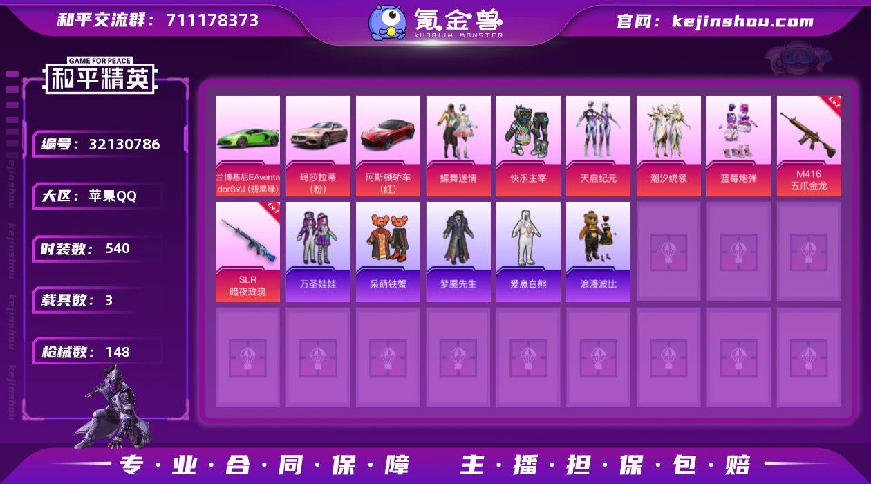 5粉装 2特效枪 3载具 11印记 可二次 可修改实名 【热门装扮】蝶舞迷情,快乐主宰,天启纪元,潮汐统领,蓝莓炮弹,S1赛事上衣,万圣娃娃,呆萌铁蟹,梦魇先生,爱崽白熊,浪漫波比 【载具】玛莎拉蒂Ghibli(粉),阿斯顿·马丁DBS(红),兰博基尼Aventador SVJ(翡翠绿) 【稀有枪皮】M416五爪金龙,SLR暗夜玫瑰 【七级特效枪】七级M416-五爪金龙 【六级特效枪】六级SLR-暗夜玫瑰 【紫色装扮】SS34特训套装,坚韧舞者,夜莺强袭者,帅气教官,完美偶像,怒火燎原,和平特警,战地菁英,圣诞大吉,决胜时刻,SS2特训,SS3特训,SS5特训,冰川特警,凛冬战士,刚毅裁决者,北国孤狼,千禧之恋,格斗先锋,热血青春,熔岩使者,特战装甲,灰色格斗者,猎鹰,甜蜜告白,疯狂小兔子,海滨突袭者,潮流炫酷,S6赛事,香草威化,SS20特训,暖心橘喵,娇憨猪猪,萌趣咩咩,SS21特训,SS18特训,SS19特训,SS30特训套装,SS31特训套装,SS33特训套装,SS23特训,SS22特训,竞技勇士朋克,SS36特训,紫俏灵猫,狙击之神,蓝彩潮人,蓝色运动,虎虎生威吉莉,街头潮人,跃动心情,长空猛禽,破蛋小黄鸡,游猎者,福星高照,竞技达人朋克,缤纷果语,雪山征服者,熔岩游骑兵连帽夹克,雪山精英,魅力单车,霓虹街区,风暴特警,蝶变,麻辣教官,黄色格斗者,龟仙人,SS17特训,星途旅人,竞技名士,SS29特训,达芬奇,SS24特训(SS24特训套装),SS25特训,萌趣绒叽,SS28特训,SS26特训,SS12特训,梦之呓语,抹茶蜜豆,红酒骑士,迷域探索者,SS8特训,PEL摇滚竞梦者,众神之王,智慧之神,SS9特训,耀粉歌者,风华少年志,SS10特训,机械征服者,SS11特训,镭射皇者,SS16特训,捷德奥特曼,时空追击者,暴风机械师,瑞龙福将,团圆交子,暗夜傀儡,银白舞王,SS13特训,科技之星,爆竹金鼠,丛林猎人,传奇侦探,特种空勤,半糖蓝莓,奇趣企鹅,贵族骑装,SS6特训,摩艾涂鸦,奇趣章鱼,云纹魔法士,玲珑飞花,淡雅