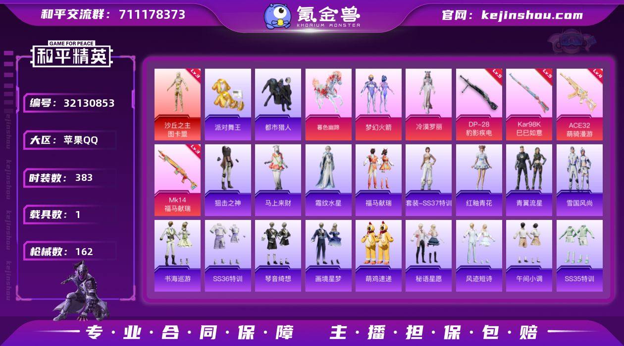 实名:可二次实名 是否支持人脸包赔:支持 粉装数量:2 特效枪数量:4 载具数:1 时装数:383 枪械数:162 都市猎人,派对舞王 三级沙丘之主-图卡盟 冷漠罗丽,梦幻火箭 五级DP-28-豹影疾电,五级Kar98K-巳巳如意,四级ACE32-萌骑漫游,三级MK14-福马献瑞 暮色幽蹄 狙击之神,马上来财,福马献瑞,霜纹水星,红釉青花,SS37特训,雨过天青,青翼流星,雪国风尚,画境星梦,琴音绮想,书海巡游,SS36特训,炫彩糖果,萌鸡速递,风迹短诗,秘语星愿,SS35特训,午间小调,元气之梦,漫游都市,懒羊羊,喜羊羊,薄荷星砂,凌霄紫焰,擎苍青焰,SS34特训套装,朱霞炽焰,冰冻风暴,缤纷果语,白糯汤圆,彩虹兔,长空猛禽,顶瓜瓜,大橘大利,登山爱好者,都市丽猫,都市猎人,绯格组合,粉恋花,福星高照,鹤鸣,湖蓝色名流,海琴烟,黑色伏地魔,黄色伏地魔,幻世战舞者,竞技达人朋克,竞技名士,极速红龙,街头潮人,街头风暴,蓝冰羽,蓝海鲸歌,浪漫天命,恋语绒绒,冷焰舞者,漫步者,猛禽,棉花软糖,弄潮海豚,霓虹热舞,派对舞王,破蛋小黄鸡,绮丽涂鸦,青团波波,云朵鹅,生化防暴队,森林游猎者,SS19特训,SS20特训,SS21特训,SS29特训,SS30特训套装,SS31特训套装,SS32特训套装,SS33特训套装,巳巳如意,探宝勇士,甜蜜告白,糖糖葫芦,完美偶像,王牌教练,迅捷狂鲨,小鸟芋圆,雪绒豹,香桃花海,星途旅人,耀粉歌者,玉兔迎春,鹰眼刺客,鱼渊荷华,燕燕于飞,异域银装,智谋强哥,紫幽梦,灼焰舞者 炫彩糖果飞行器,灵珠游龙飞行器,提桶跑路飞行器,罪夜之冕降落伞,暮色玫影降落伞,炫彩糖果降落伞,魔童闹海 敖丙降落伞,第五大道降落伞,鬼刀降落伞,梦幻火箭降落伞,星穹咏叹调降落伞 卖家说:和平王者连体一起出了可砍