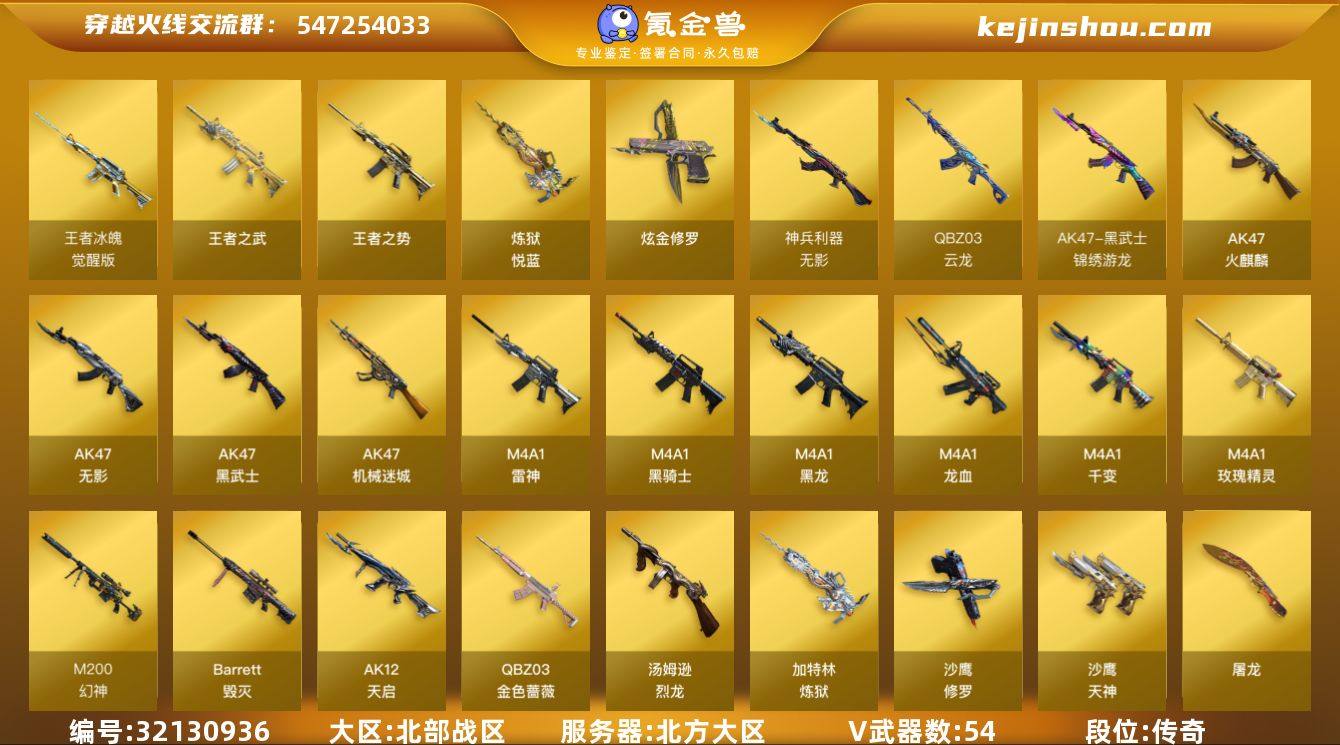 北方大区-62V-4王者武器数-1炫金武器数 【热门武器】:QBZ03-金色蔷薇,M200-幻神,M4A1-黑骑士,汤姆逊-烈龙,加特林-炼狱*3,MK5-炽火炎龙,沙鹰-修罗*2 【王者炫金武器】:王者之势,王者之武,炼狱-悦蓝,炫金修罗 【音效卡】:M4A1-黑骑士音效卡 【皮肤】:幻神-电竞之星 皮肤,裁决-运输船 皮肤,雷神-暗月,雷神-荣耀世冠AG,火麒麟-平天大圣,火麒麟-心动糖果,毁灭耀金皮肤,毁灭-CFS2020,毁灭-虹光风暴 皮肤,M4A1-千变-孔明皮肤,黑龙-能量核心,黑骑士-暗月,无影-暗月,无影-能量核心,天启-暗月,战神-粉色甜心皮肤,战神-紫绶金章皮肤,战神-流金岁月皮肤,屠龙-惊鸿 皮肤,麒麟刺-甜蜜糖果 皮肤 【角色】:零,樱,研,王者春,奇洋探员,空,暗夜-X,嘉年华灵狐,娟娟,兰妹妹,灵狐者-黄金海岸,龙儿-小淘气,曼陀罗-X,萌儿,潘多拉-X,潘多拉-甜心教官,斯沃特-X,蜀雪,雪莉杨-摸金校尉,影武者-X 【人偶武器】:MK5-炽火炎龙,AWM-灵狐-15周年嘉年华,迷你深渊冰龙*2,迷你牛魔王,迷你生化手雷,闪光弹-小乔,QBZ03-斯沃特 【暴走生化】:超级对讲机 【挑战大师】:AK47-冰龙粉碎者,冰龙粉碎者-白马银枪,激光毁灭者III,KAC-圣炎切割者III,神圣爆裂者-末日III 【英雄级武器】:M4A1-千变,AK47-火麒麟,M4A1-黑龙,M4A1-雷神,M4A1-黑骑士,AK47-无影,AK47-黑武士,AK12-天启,AK47-机械迷城,M4A1-龙血,QBZ03-天罚,无影-神兵利器,QBZ03-云龙,黑武士-锦绣游龙,M4A1-玫瑰精灵,QBZ03-金色蔷薇,AK-47-猩红传说,AK47-B-战神,王者冰魄-觉醒版,Barrett-毁灭,M200-幻神,加特林-炼狱*3,汤姆逊-烈龙,沙鹰-修罗*2,沙鹰-天神,柯尔特-电竞之星,屠龙*2,龙啸*2,擎天,麒麟刺,幻灵之锋,高爆手雷-幻灵*2,高爆手雷-神工天巧,高爆手雷-云龙,手雷-热带奇洋,闪光弹-幻灵*2,闪光...