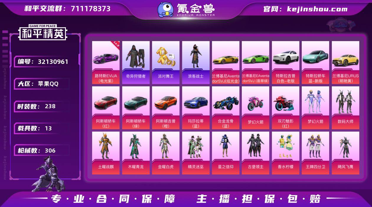 h10045【载具号】14粉10特13载具 派对舞王 梦幻火箭 洛天依 7把满级枪皮 3级路特斯 金兰博 苹果 手Q-14粉装-10特效枪-13载具-5粉色飞行器-132597热力值-25王牌印记-238套装-306枪皮 【红色载具】:路特斯EVIJA(电光紫)(三级) 【热门品类】:粉装-梦幻火箭,套装-浪漫天命,套装-派对舞王,套装-奇异狩猎者,角色-军刀雅典娜,套装-浪客战士,套装-SS1特训,套装-暗影哥特,套装-浪漫波比,套装-粉红小猪,熔岩游骑兵连帽夹克 【粉色套装】:粉装-数码大师,粉装-土曜战麒,粉装-木曜青龙,粉装-金曜白虎,粉装-精灵迷巫,粉装-梦幻火箭,粉装-星之信仰,粉装-古堡领主,粉装-香水柠檬,粉装-王牌四分卫,粉装-飓风飞鹰,角色-洛天依,角色-歌者泠鸢,粉装-未来歌姬 【粉色枪皮等级】:AKM-炫紫旋律(七级),SCAR-L-梦幻火箭(七级),M416-五爪金龙(七级),M416-电玩时刻(三级),M762-甜蜜誓约(七级),M762-电糖天使(三级),M24-星之信仰(七级),AWM-橘柚倾心(五级),SLR-暗夜玫瑰(七级),DP-28-扶摇飞仙(七级) 【粉色载具】:路特斯EVIJA(电光紫),特斯拉Model X(珍珠白),特斯拉Roadster(水滴蓝),兰博基尼Aventador SVJ(翡翠绿),兰博基尼Aventador SVJ(炫光金),兰博基尼URUS(明艳黄),阿斯顿马丁DBS(红),阿斯顿马丁DBS(绿),阿斯顿马丁DBX(橙),玛莎拉蒂Ghibli(蓝),合金龙骨(蓝),双人摩托-梦幻火箭,双人摩托-双刃魅影(红) 【粉色枪皮】:AKM-炫紫旋律,SCAR-L-梦幻火箭,M416-五爪金龙,M416-电玩时刻,M762-甜蜜誓约,M762-电糖天使,M24-星之信仰,AWM-橘柚倾心,SLR-暗夜玫瑰,DP-28-扶摇飞仙 【粉色飞行器】:梦幻火箭飞行器,四圣焕新飞行器,马卡龙飞行器,齐天大圣飞行器,天之羽翼飞行器 【粉色降落伞】:极限特训降落伞,幻影战神降落伞,百万伏特降落伞,未来战士降落...