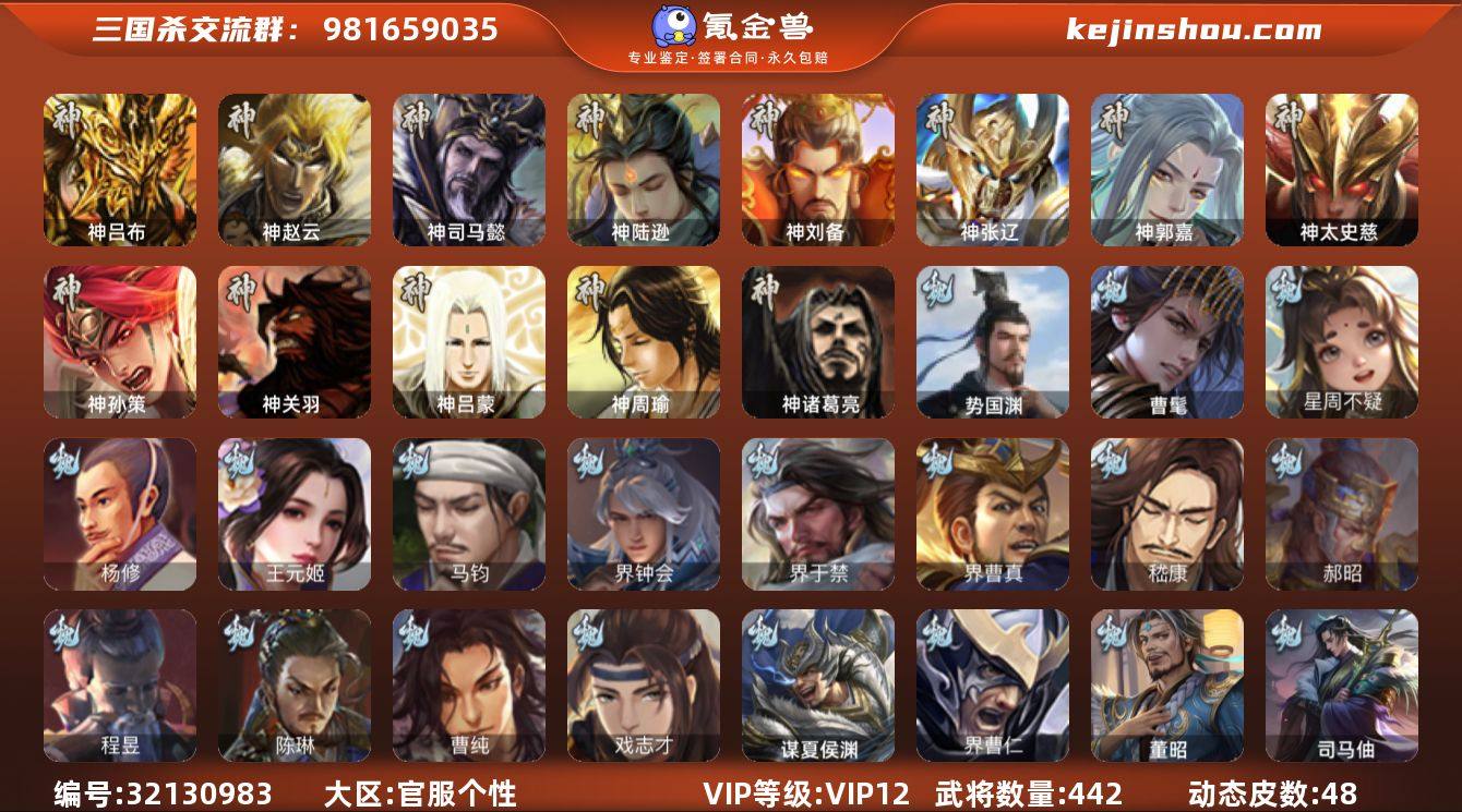 【3719】官阶:大将军;VIP等级:VIP12;史诗武将数量:66;动态皮肤数量:48;武将总数:442;史诗宝珠数量:26;将魂数量:5346;神将:10;魏国史诗武将:22;蜀国史诗武将:14;吴国史诗武将:7;群史诗武将:22 神吕布,神赵云,神司马懿,神陆逊,神刘备,神张辽,神郭嘉,神太史慈,神孙策,神诸葛亮,曹髦,星周不疑,杨修,王元姬,马钧,界钟会,界于禁,界曹真,嵇康,郝昭,陈琳,曹纯,戏志才,势国渊,程昱,关索,马云騄,谋赵云,谋马超,诸葛瞻,周群,赵襄,张星彩,王平,沙摩柯,谯周,界黄忠,花鬘,董允,周处,骆统,留赞,界朱然,界徐盛,界步练师,贺齐,十常侍,左慈,郑玄,张让,张琪瑛,王允,苏飞,麹义,庞德公,南华老仙,祢衡,界左慈,界李儒,公孙康,杜预,谋张角,许攸,星董卓,兀突骨,士燮,司马昭,神吕蒙,神周瑜,神关羽,SP关羽,SP曹仁,SP蔡文姬,乐进,曹昂,诸葛诞,朱灵,文聘,SP姜维,张春华,钟会,曹冲,郭淮,满宠,界王异,界曹操,界司马懿,界夏侯惇,界张辽,界许褚,界郭嘉,李典,曹真,韩浩史涣,陈群,曹叡,曹休,钟繇,司马朗,王基,李通,郭皇后,孙资刘放,辛宪英,界甄姬,吕虔,鲁芝,蒯越蒯良,界典韦,界荀彧,界徐晃,杜畿,界曹丕,毌丘俭,界邓艾,张恭,贾逵,界曹植,界满宠,界郭淮,卞夫人,辛毗,蔡贞姬,袁涣,王双,崔琰,毛玠,谋徐晃,谋于禁,界曹休,牵招,胡班,司马孚,司马伷,谋夏侯渊,牛金,界夏侯渊,界曹仁,臧霸,唐咨,董昭,势陈到,SP孙尚香,关银屏,夏侯霸,马良,关兴张苞,廖化,界马岱,关平,简雍,刘封,界法正,界关兴张苞,界刘备,界关羽,界张飞,界赵云,界马超,SP徐庶,吴懿,周仓,张松,刘谌,夏侯氏,糜竺,马忠,孙乾,李严,黄皓,吴苋,秦宓,界黄月英,界诸葛亮,赵统赵广,严颜,界伊籍,界卧龙诸葛,界庞统,界孟获,界祝融,陈到,界姜维,界刘禅,吕凯,张翼,杨仪,界廖化,邓芝,傅肜,界简雍,费祎,糜夫人,王甫赵累,许靖,向宠,彭羕,谋庞统,界张嶷,谋姜维,谋张飞,霍峻,诸葛果,界魏延,蒋琬费祎,糜芳...