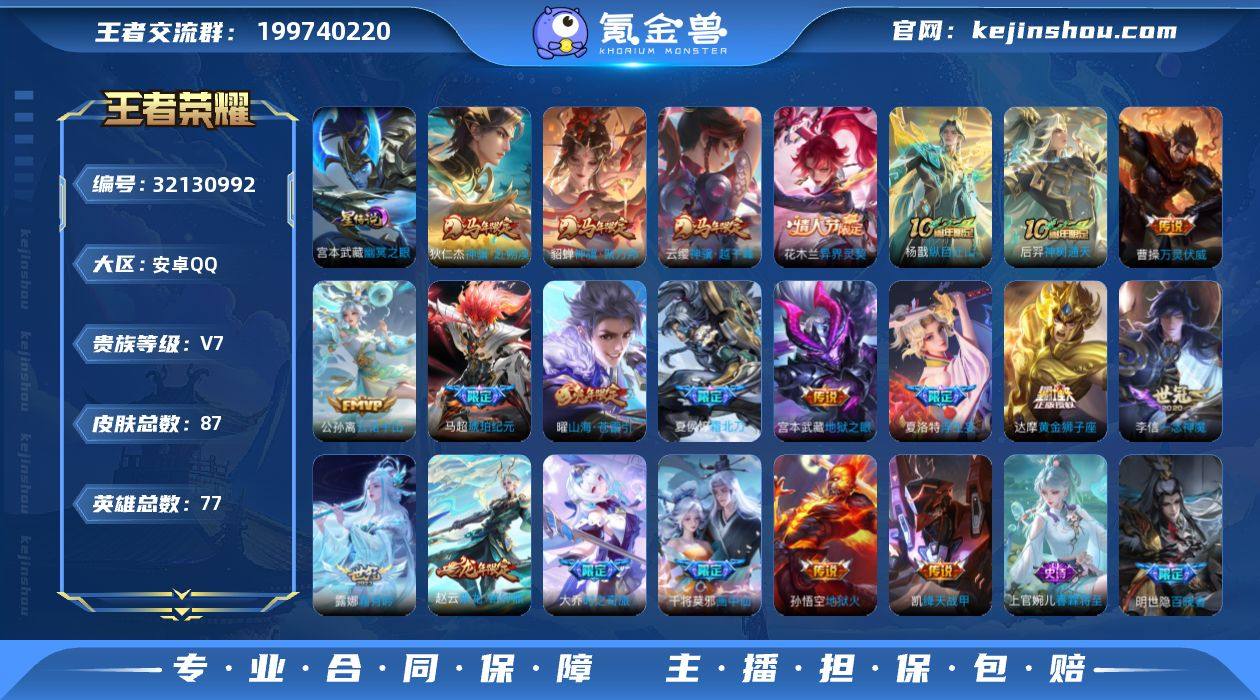 【准v8,21传说1星传说,都是新皮,木兰曹操新传说,狄仁杰云樱貂蝉马年限定,赵云龙年限定,都是精品皮,1天幕,15套按键,差800多v8,5改名卡】贵族7 星传说1 传说皮肤21 史诗皮肤27 皮肤数量87 皮肤价值:78156 英雄77 非凡王者 总场次1071