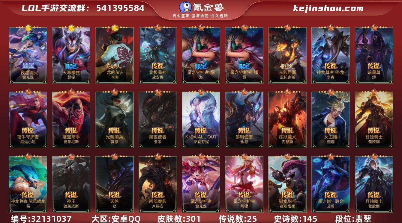 实名:可二次实名 段位:翡翠 英雄数:133 皮肤数:301 神话皮肤数量:3 传说皮肤数量:25 终极数:0 典藏皮肤数量:0 夜星流火 金克丝,天命豪侠 瑟提,龙的传人 北极星神 黛安娜,星之守护者 熠,星之守护者 辉,光影巨翼亚托克斯,神龙尊者 圣龙 李青,暗星尊,福牛守护者女枪,灌篮高手,光明哨兵薇恩,黑夜使者亚索,K/DA ALLOUT萨勒芬妮,黎明使者永恩,炼狱魔犬,女主播风女,日蚀骑士蕾欧娜,神龙尊者 驭风啸龙,神王诺手,天煞劫,西部魔影卢锡安,星之守护者金克丝,星之守护者阿狸,驯龙炮手,源计划:联合,月蚀骑士蕾欧娜,星之守护者卡莎,灵魂莲华腕豪 欧米伽小队 天雷爆破手 维迦,死亡誓约劫,礼物选好了吗? 布隆,我,羽饰骑士 崔丝塔娜,双城之战:天资 金克丝,猎梦吞噬体 卡兹克,东恒之曜奥瑞利安索尔,劲道美味 阿木木,小蜜蜂努努和威朗普,玉剑传说 无影,奈落之炎 慎,电玩魔爵 佛耶戈,电玩女神 凯特琳,柚子软糖,战斗学院 杰斯,弹幕天使,福牛守护者诺手,暗星皇子,暗星螳螂,奥术大师吉格斯,霸天龙神龙王,霸天异形螳螂,白色死神韦鲁斯,冰川巨兽石头人,苍穹之光火男,持胡萝卜的雪人,大魔王,盗梦者,地下拳王,地狱行者猴子,电玩勇者(伊泽瑞尔),恶魔之刃,福牛守护者牛头,福牛守护者安妮,钢铁军团,古神狼人,海之歌泽丽,光明哨兵锐雯,禁卫机甲,惊悚派对,绝命机甲男枪,K/DA ALL OUT阿狸,K/DA ALL OUT阿卡丽,K/DA ALL OUT寡妇,K/DA ALL OUT卡莎,黎明使者卡尔玛,猎龙勇士潘森,燎原烈焰蔚,猎龙勇士奥拉夫,猎龙勇士赵信,灵魂莲华提莫,灵魂莲华莉莉娅,灵魂烈焰,灵魂收割者,灵能特工莎弥拉,灵能特工劫,魅惑女巫女枪,魅惑女巫薇古丝,猛虎布隆,魅惑女巫莫甘娜,梦境灵探赛娜,秘旅探索者龙女,秘旅探索者加里奥,灭迹行者烬,暮星之羽,娜就去看看,奈落之炎,欧米伽小队 鬼影蛙人,欧米伽小队 魔鬼伞兵,破败军团龙女,清剿小队金克丝,清剿小队潘森,绒毛,丧尸努努,殇之机器人,摄魂猎手凯隐,神龙尊者 苍龙,神龙尊者 魔龙,神龙尊者 玉境灵龙,神奇先驱杰斯,圣诞老人,铁血女忍,未来战士潘森,未来战士卢锡安,未来战士慎,我,怒角,武神,无限烈焰,西部魔影诺手,西部魔影锤石,西部魔影 执行人,西部牛仔,腥红之月剑魔,腥红之月烬,星域先知(可升级),星域学者,星之守护者萨勒芬妮,星之守护者风女,星之守护者璐璐,星之守护者EZ,虚空海灵,驯龙女巫,银河魔装机神小鱼人,银河魔装机神龙女,泳池派对璐璐,泳池派对女警,泳池派对鳄鱼,泳池派对男枪,泳池派对盲僧,泳池派对剑姬,玉剑传说 寒潭夭夭,玉剑传说 无极,玉剑传说 武剑仙,玉剑传说 无双,源代码青钢影,源计划:裁决,源计划:火,源计划:燃,源计划:雷,源计划:阴,战场之王亚索,战斗学院拉克丝,战斗学院蕾欧娜,战斗学院阿克尚,真实伤害赛娜,光明哨兵奥拉夫,幻梦甜心阿狸,太空律动璐璐,小蜜蜂提莫,盗梦暗影,未来战士剑姬,霸天剑魔亚托克斯,烘焙童谣猫咪,星之守护者琴女,伯爵卡萨丁,探梦奇旅艾克,灵魂莲华小炮,心之钢伊泽瑞尔,屠龙勇士凯尔,暗星墨菲特 冠翎征服者 尼菈,冠翎巨神像 加里奥,冠翎御风使 迦娜,冠翎飞行员 库奇,龙冕异士戏命师,双城之战:破枷 蔚,龙冕神策吉格斯,冰川勇者,光耀之灵,黑暗骑士寒冰,蕉泥座人,猎龙勇士布隆,熊猫,迅剑,黯黑魔龙龙女,暗黑女武神皎月,暗黑武士狮子狗,暗影,暴风女神,冰霜之刃,冰霜烈焰,冰霜亚龙,苍穹之光薇恩,超级英雄,超武乾坤:电弧,冲击之刃劫,冲浪高手,穿