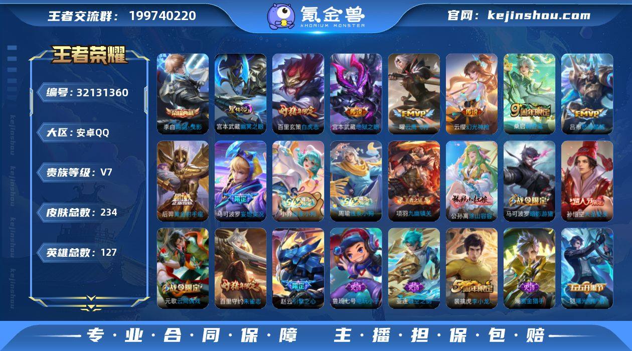 贵族等级:V7 典藏皮肤数:1 珍品无双皮肤数:0 无双皮肤数:0 珍品传说皮肤数:0 传说皮肤数:8 史诗皮肤数:55 皮肤数:234 英雄数:127 段位:王者 卖家说:贵族等级:V7,累计充值2000+,账号基础价值高 - 皮肤数量:234款皮肤(含74款限定、8款传说、1颗未兑换荣耀水晶) - 英雄数量:127个英雄,接近全英雄,铭文配置齐全 - 段位:S42赛季最强王者2星,巅峰赛1177分 - 信誉等级:7级,无违规记录,游戏体验流畅 - 收藏等级:46级资深收藏家,图鉴等级51级