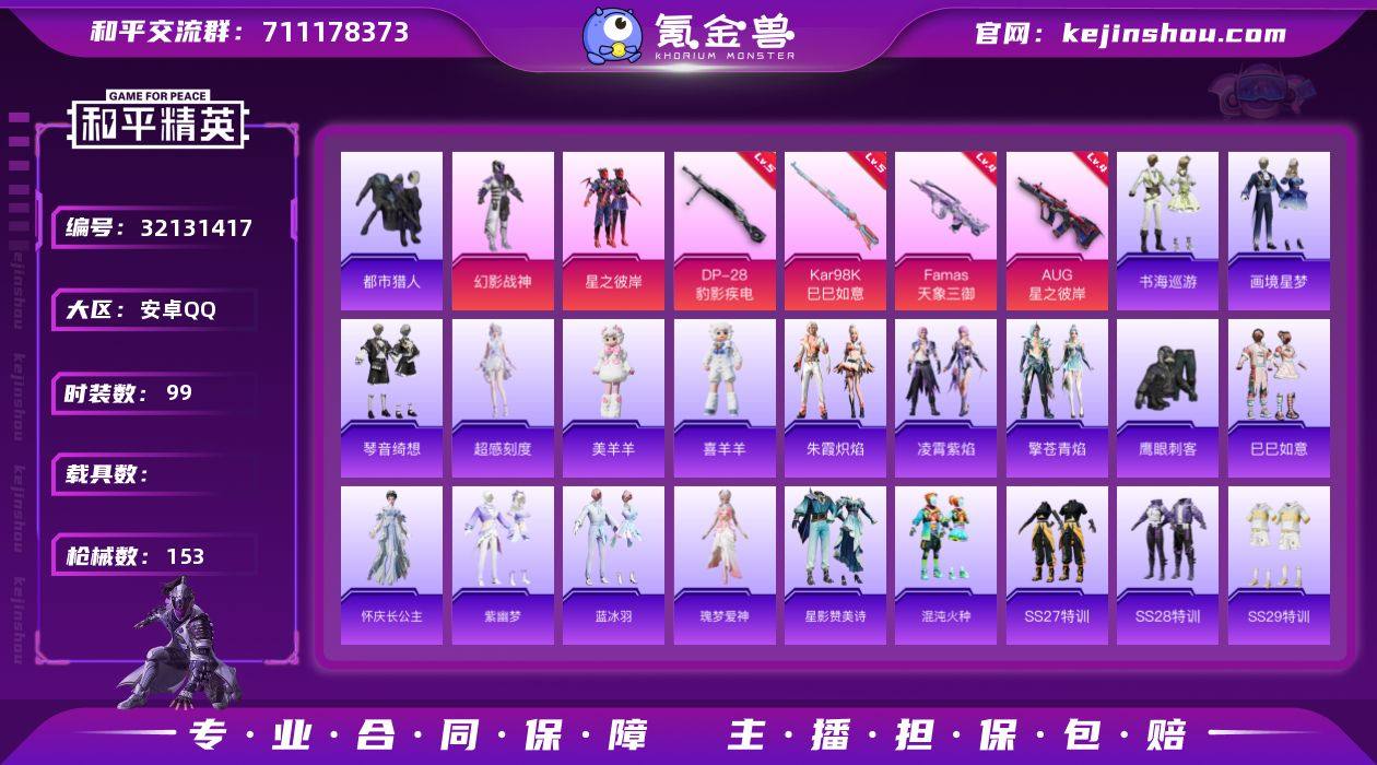 可二次【特价出售/店主推荐】安卓 手Q-2粉装-11特效枪-0载具-3粉色飞行器-43292热力值-5王牌印记-99套装-153枪皮 【热门品类】:套装-都市猎人 【粉色套装】:粉装-幻影战神,粉装-星之彼岸 【粉色枪皮等级】:AUG-星之彼岸(四级),Famas-天象三御(四级),ACE32-萌骑漫游(一级),UMP45-萌骑冒险(一级),AKS-74U-森灵之息(五级),Kar98K-巳巳如意(五级),Mk14-福马献瑞(五级),AA12-G-萌骑幻想(一级),DP-28-豹影疾电(五级),M338-回旋牧梦使(四级),信号枪-金乌曜日(三级) 【粉色枪皮】:AUG-星之彼岸,Famas-天象三御,ACE32-萌骑漫游,UMP45-萌骑冒险,AKS-74U-森灵之息,Kar98K-巳巳如意,Mk14-福马献瑞,AA12-G-萌骑幻想,DP-28-豹影疾电,M338-回旋牧梦使,信号枪-金乌曜日 【粉色飞行器】:炫彩糖果飞行器,星之彼岸飞行器 【粉色降落伞】:绝对恒星降落伞,幻影战神降落伞,星之彼岸降落伞,洛神天依降落伞,精灵梦叶罗丽降落伞,忍者神龟降落伞,未来领航者降落伞,精灵之光降落伞,智耀战神降落伞,喜羊羊与灰太狼降落伞,魔童闹海 哪吒降落伞,异瞳寒姬降落伞,炫彩糖果降落伞,暮色玫影降落伞,回旋牧梦使降落伞,罪夜之冕降落伞,辉光之愿降落伞 【稀有套装】:套装-巳巳如意,角色-超感刻度,套装-雪国风尚,套装-炫彩糖果,套装-马上有钱,角色-怀庆长公主,套装-紫幽梦,套装-蓝冰羽,角色-瑰梦爱神,套装-星影赞美诗,套装-混沌火种,套装-朱霞炽焰,套装-凌霄紫焰,套装-擎苍青焰,玩偶服-美羊羊,玩偶服-喜羊羊,套装-书海巡游,套装-画境星梦,套装-琴音绮想,角色-月烬之祷,套装-雨过天青,套装-红釉青花,角色-唐三 【稀有枪皮】:AUG-冰晶雪宝,AKM-影袭,AKM-星之彼岸,M16A4-幻世战舞者,SCAR-L-夜灯,M416-红色方程式,M416-蓝色火焰,GROZA-影袭,AUG-冰川粉黛,AUG-甜蜜菠萝,AUG-绝...