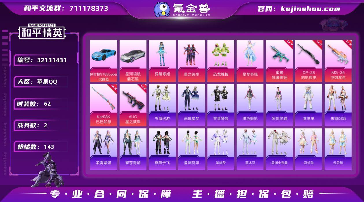 【特价出售/店主推荐】苹果 手Q-4粉装-8特效枪-2载具-3粉色飞行器-37478热力值-6王牌印记-62套装-143枪皮 【粉色套装】:粉装-星之彼岸,粉装-恐龙拽拽,角色-星梦奇缘,角色-异瞳寒姬 【粉色枪皮等级】:AUG-星之彼岸(二级),蜜獾-异瞳寒姬(七级),UMP45-萌骑冒险(二级),AKS-74U-森灵之息(五级),Kar98K-巳巳如意(五级),Mk14-福马献瑞(五级),DP-28-豹影疾电(五级),MG-36-沧焰双生(五级) 【粉色载具】:星河领航(磐石银),保时捷918 Spyder(沉静蓝) 【粉色枪皮】:AUG-星之彼岸,蜜獾-异瞳寒姬,UMP45-萌骑冒险,AKS-74U-森灵之息,Kar98K-巳巳如意,Mk14-福马献瑞,DP-28-豹影疾电,MG-36-沧焰双生 【粉色飞行器】:香车宝马飞行器,炫彩糖果飞行器,智趣喵喵飞行器 【粉色降落伞】:星之彼岸降落伞,恐龙拽拽降落伞,桃粉嫣然降落伞,时光之誓降落伞,冷漠罗丽降落伞,绯穹魔姬降落伞,无垠阁降落伞,异瞳寒姬降落伞,极意拳锋降落伞,炫彩糖果降落伞 【稀有套装】:套装-雪国风尚,套装-炫彩糖果,套装-马上来财,套装-燕燕于飞,套装-鱼渊荷华,套装-紫幽梦,套装-蓝冰羽,套装-星渊小夜曲,套装-彩虹兔,套装-云朵鹅,套装-雪绒豹,角色-乐音,套装-朱霞炽焰,套装-凌霄紫焰,套装-擎苍青焰,玩偶服-喜羊羊,角色-绯色魅影,角色-紫俏灵猫,套装-书海巡游,套装-画境星梦,套装-琴音绮想,套装-雨过天青,套装-红釉青花 【稀有枪皮】:AUG-冰晶雪宝,AKM-星之彼岸,AKM-破晓战魂,M16A4-幻世战舞者,M16A4-红色方程式,M16A4-蓝色火焰,SCAR-L-夜灯,SCAR-L-炫彩节奏,SCAR-L-红色方程式,M416-红色方程式,M416-蓝色火焰,GROZA-荧海星豚,AUG-耀粉歌者,M762-彩虹符号,M762-云朵鹅,蜜獾-天降萌叽,ACE32-画境星梦,ARX-凌霄紫焰,UZI-啾咪啾咪,UZI-红色方程式,UMP45-夜灯,UMP45-生命誓言,UMP...