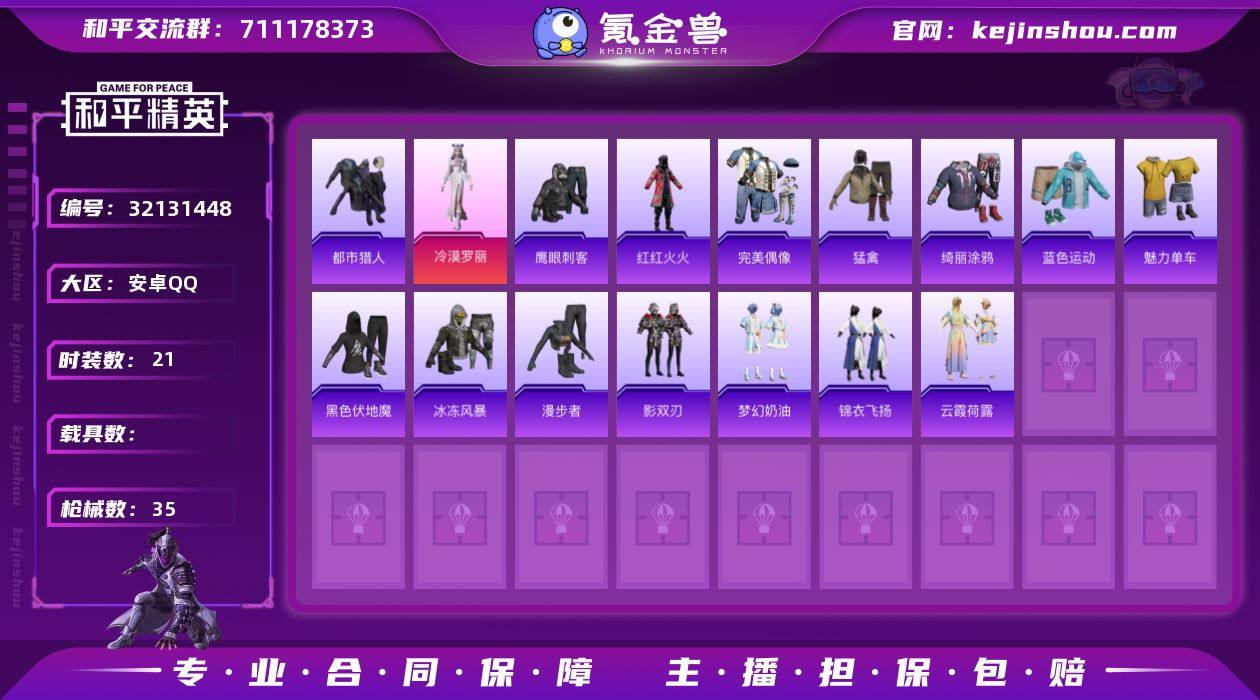 J2503 精品 1粉 1特 都市猎人 冷漠萝莉 安卓 手Q-1粉装-1特效枪-0载具-1粉色飞行器-9880热力值-0王牌印记-21套装-35枪皮 【热门品类】:套装-都市猎人,套装-红红火火 【粉色套装】:角色-冷漠罗丽 【粉色枪皮等级】:ACE32-萌骑漫游(五级) 【粉色枪皮】:ACE32-萌骑漫游 【粉色飞行器】:黄族统领飞行器 【粉色降落伞】:星之彼岸降落伞,旋转彩虹降落伞 【稀有枪皮】:AKM-影袭,M16A4-幻世战舞者,SCAR-L-炫彩节奏,M416-蓝色火焰,GROZA-影袭,QBZ-彩虹符号,Mk47-炫光之旅,UZI-影袭,AKS-74U-鬼刀,Kar98K-影袭,M24-影袭,M24-拂晓神骑,Mini14-穿刺龙虾,M417-惊鸿侠骨,S686-生命誓言,S12K-香水柠檬,DP-28-旋转彩虹,MG3-幻世战舞者,MG3-惊鸿侠骨,PKM-拂晓神骑,沙漠之鹰-旋转彩虹,撬棍-冷漠罗丽 【其他套装】:套装-完美偶像,套装-猛禽,套装-红红火火,套装-绮丽涂鸦,套装-蓝色运动,套装-魅力单车,套装-黑色伏地魔,套装-鹰眼刺客,套装-冰冻风暴,套装-漫步者,套装-影双刃,套装-梦幻奶油,套装-锦衣飞扬,套装-云霞荷露 【营地ID】:941672551