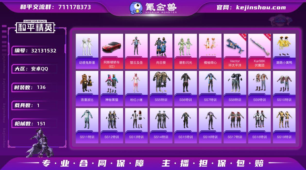 【特价出售/店主推荐】安卓 手Q-4粉装-2特效枪-1载具-0粉色飞行器-53132热力值-10王牌印记-136套装-151枪皮 【热门品类】:套装-动感兔斯基人偶服,套装-潮萌小黄鸭,套装-浪漫波比,套装-粉红小猪 【粉色套装】:粉装-彗云及圣,粉装-向日葵,粉装-碧影闪光,粉装-橘柚倾心 【粉色枪皮等级】:Vector-环太平洋(六级),Kar98K-伏魔团(五级) 【粉色载具】:阿斯顿马丁DBS(红) 【粉色枪皮】:Vector-环太平洋,Kar98K-伏魔团 【粉色降落伞】:金风玉露降落伞,PEL轰鸣竞梦者降落伞,古堡领主降落伞,四圣焕新降落伞,潮汐统领降落伞,银刃赛罗降落伞,香水柠檬降落伞,王牌四分卫降落伞,暗夜玫瑰降落伞,星夜魔法师降落伞,旋转彩虹降落伞 【稀有枪皮】:AKM-四圣焕新,AKM-夜灯,AKM-彩虹符号,AKM-春暖花开,AKM-灼热熔岩,AKM-玉龙,AKM-生命誓言,AKM-虎虎生威,AKM-霓虹街区,M16A4-夜灯,M16A4-幻世战舞者,M16A4-机械英豪,M16A4-甜心亚梦,M16A4-红色方程式,M16A4-蓝色火焰,SCAR-L-暗夜玫瑰,SCAR-L-炫彩节奏,SCAR-L-玉兔迎春,SCAR-L-红色方程式,M416-夜灯,M416-红色方程式,GROZA-异彩先驱,GROZA-治愈之星,GROZA-生命誓言,GROZA-黑色刀锋,AUG-天降萌叽,QBZ-原初圣火,QBZ-彩虹符号,QBZ-神秘黑猫,M762-拳皇97,M762-牛气冲天,M762-绯红前夜,M762-镭射皇者,Mk47-天之羽翼,G36C-不夜海上花,G36C-金风玉露,AC-VAL-天降萌叽,AC-VAL-彩虹甜喵,AC-VAL-甜心亚梦,UZI-众神之王,UZI-啾咪啾咪,UZI-天降萌叽,UZI-红色方程式,UMP45-夜灯,UMP45-蓝色火焰,Vector-PEL轰鸣竞梦者,Vector-彩虹符号,Vector-治愈之星,Vector-生命誓言,Vector-香水柠檬,Vector-黑色刀锋,汤姆逊-勇闯险境,汤姆逊-奇异狩猎者,汤姆逊-幻影战神,汤姆逊-异彩先驱,野牛-机械英豪,MP5K-众神之王,MP5K-异彩...