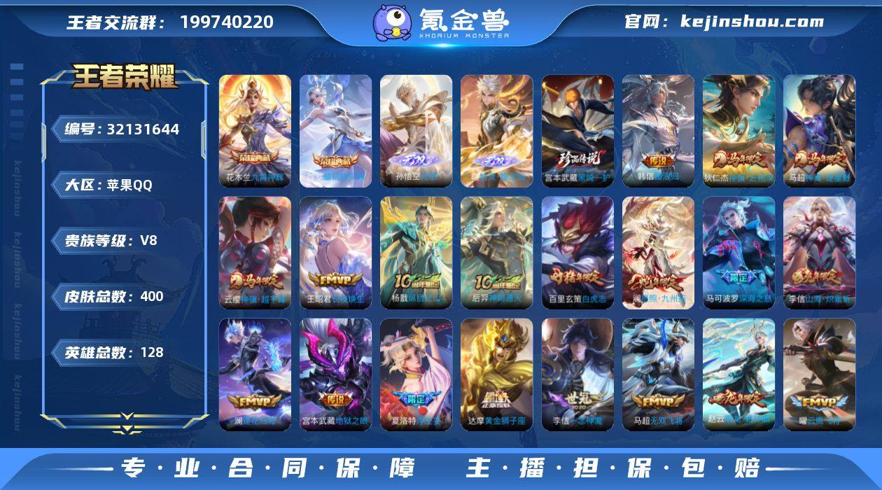 贵族等级:V8 典藏皮肤数:2 珍品无双皮肤数:0 无双皮肤数:2 珍品传说皮肤数:1 传说皮肤数:33 史诗皮肤数:109 皮肤数:400 英雄数:128 段位:荣耀王者
