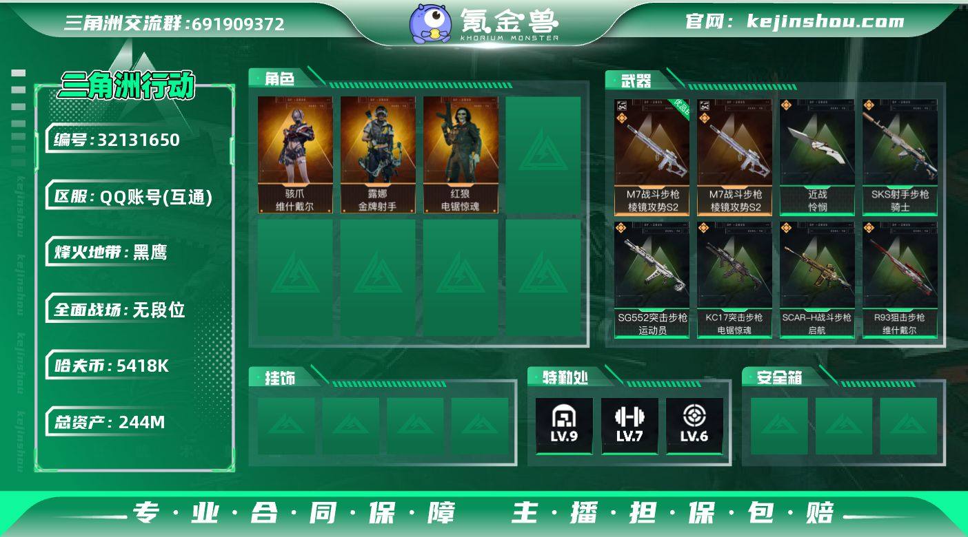 A11073/可二次/QQ区/【0封】【总资产:244.2M+113AW子弹+M7棱镜攻势(优品B)+维什戴尔】/烽火等级:60级/全面战场:1级/纯币:5418K/三角券加币:42【近战-怜悯】【M7棱镜攻势(优品B)】【骇爪-维什戴尔】【红狼-电锯惊魂/露娜-金牌射手】部门:33333/特勤等级(技术中心3级/工作台3级/制药台3级/防具台3级/仓库9级/指挥中心6级/训练中心7级/靶场6级/潜水中心2级/收藏室1级)(流动资产:158.6M)R93狙击步枪-维什戴尔/KC17突击步枪-电锯惊魂/3橙色挂饰/段位:黑鹰II/详情看图