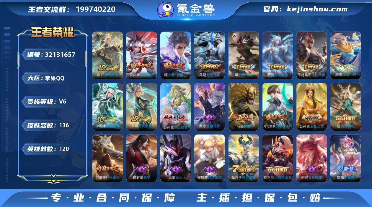 实名: 可修改 性别: 女号 贵族等级: V6 英雄数: 120 皮肤数: 136 传说皮: 云鹰飞将,久胜战神,游龙清影,无双飞将,山海·苍雷引,神树通天 限定皮: 祈雪灵祝,梁祝,神威,朱雀志,高山流水,匿光追影者,女儿国国王,玉兔公主,五谷丰年,山海·玄木吟 亮点: 【优质装备】:云鹰飞将(小将军),久胜战神,游龙清影(小青龙),无双飞将,山海·苍雷引(电光曜子),涂山容容