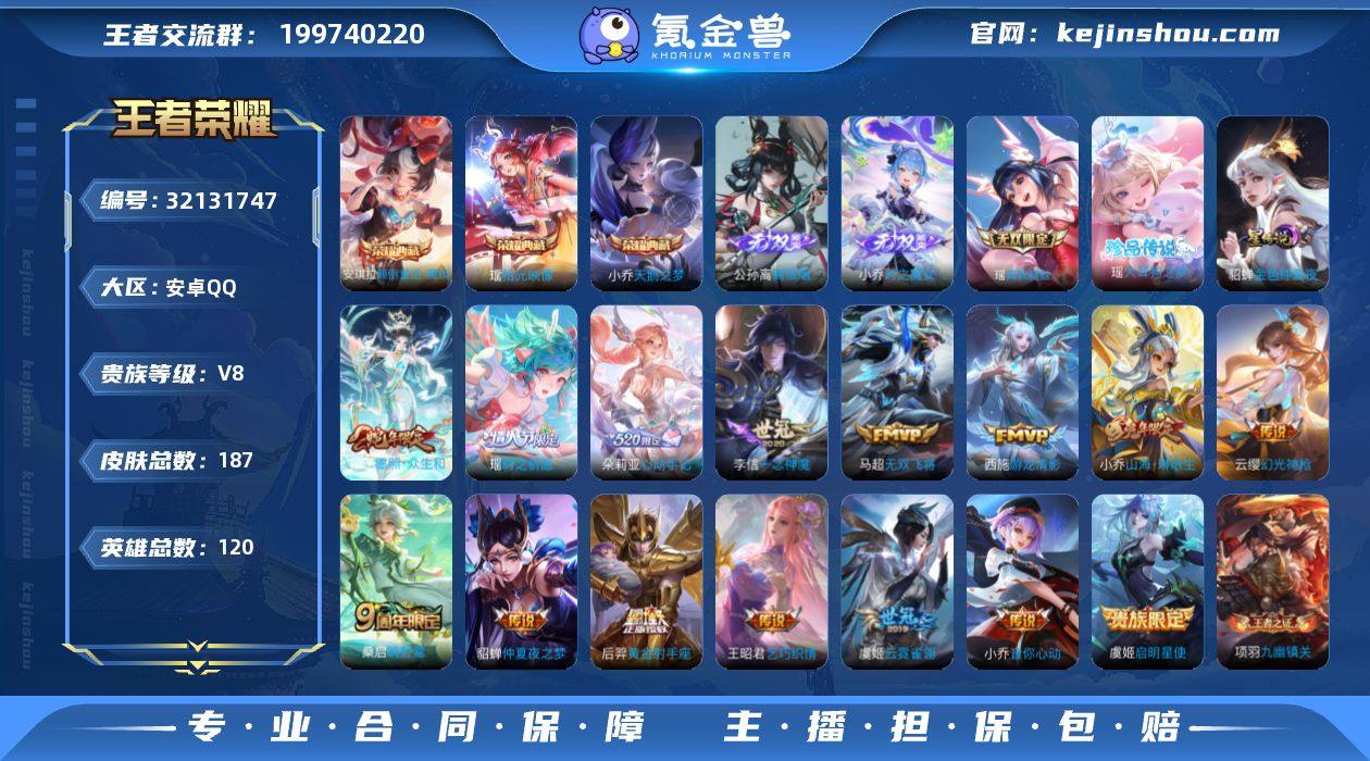 【瑶瑶全皮,小乔差1全皮,v8女号,3水3无双1珍品15传说2星传说,安琪拉新典藏皮,朵朵情限,公孙离小乔要瑶瑶无双,妲己抹茶,17套按键,差1k多v9】贵族8 荣耀典藏3 无双3 珍品传说1 星传说2 传说皮肤15 史诗皮肤61 皮肤数量187 皮肤价值:186432 英雄120 最强王者 总场次5040